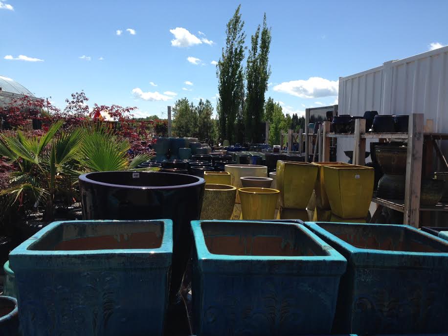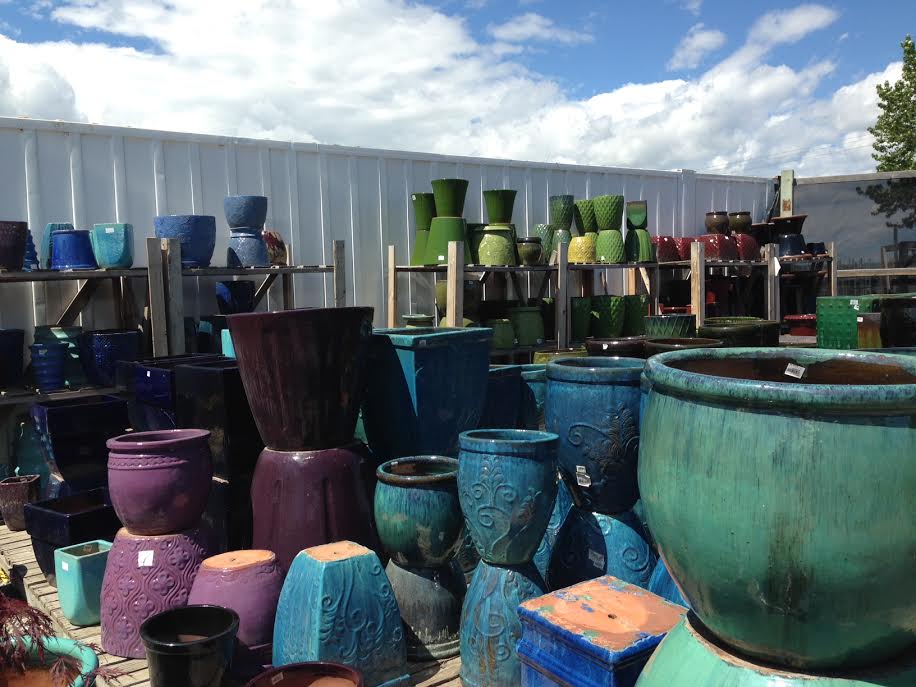 When I stopped by “Spruce It Up” garden centre in Calgary to pick up a couple plants I came across a treasure trove of ceramic pots. During my previous (first) visit, there, I was head-down in the rain, on a mission to find a Medora juniper, which I found and beat a hasty retreat. This trip I took my time looking around and found a wide variety of annuals and perennials as I would expect, but also a fantastic display of fountains, birdbaths, garden ornaments and piles of pots – displayed by colour – oh yes, the organizer in me was gleefully punching my gardener self in the arm. The possibilities!