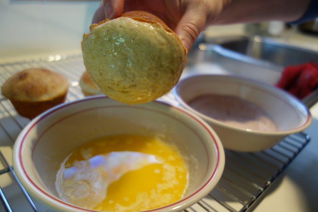 While muffins are still warm, dip in the melted butter and then in the cinnamon and sugar mixture.