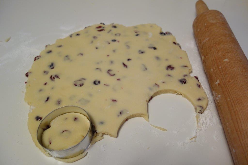 Cream butter and sugar. Beat in eggs, one at a time. Add dry ingredients, then cranberries. Roll out to 1/4” thick on a floured board. Cut into 2 inch rounds.