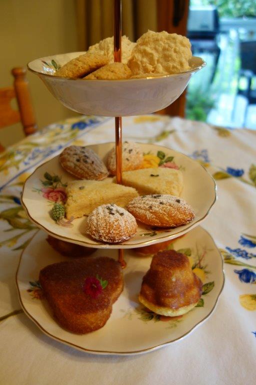 My sister-in-law and I had a baking bonanza last week. The photo above is from our last baking morning together. We subscribe to the theory that if the mixer is already out…surely there is something else we can make with it! We only get together once a year or thereabouts, so we do a lot of baking while we have “a partner in crime”. What one doesn’t think of, the other one does so we have a lot of fun. Since our last visit, she has “discovered” madeleine making and has made them in dozens of flavours. I was eager to have a lesson as I’ve never even tasted them before. We ended up making 5 kinds of madeleine (lemon, apricot-coconut-rum, lavender, rosewater-cardamom and strawberry-white-chocolate). And…since we had leftover lavender, coconut and lemons, we tried out some new recipes for other types of baking as well: lavender lemon shortbread, coconut macaroons, lemon tea cakes, amaretti, and gingerbread saskatoon cake.