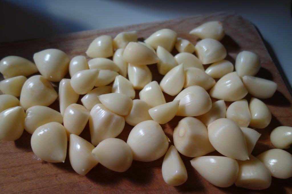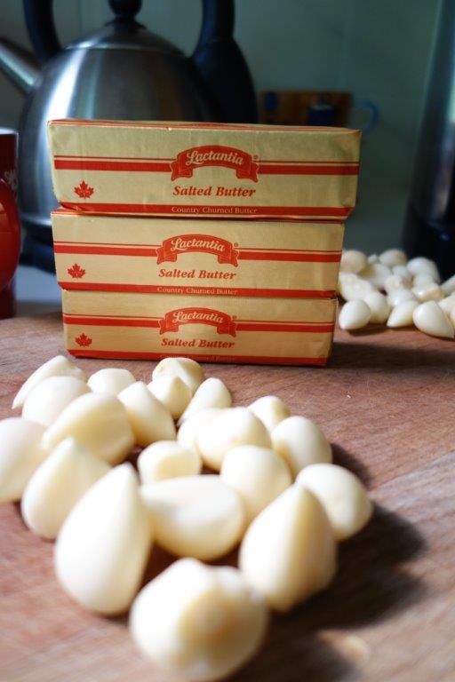 I like to make garlic butter with some of our crop of garlic from the garden. I put about 20 cloves of garlic in the food processor and chop it until the pieces are small. I add three sticks of butter at room temperature, salt and pepper to taste, and turn on the processor to combine everything. I scoop the result onto a piece of waxed paper and roll it up. I keep this in the freezer and just cut off a slice when I want some garlic butter.