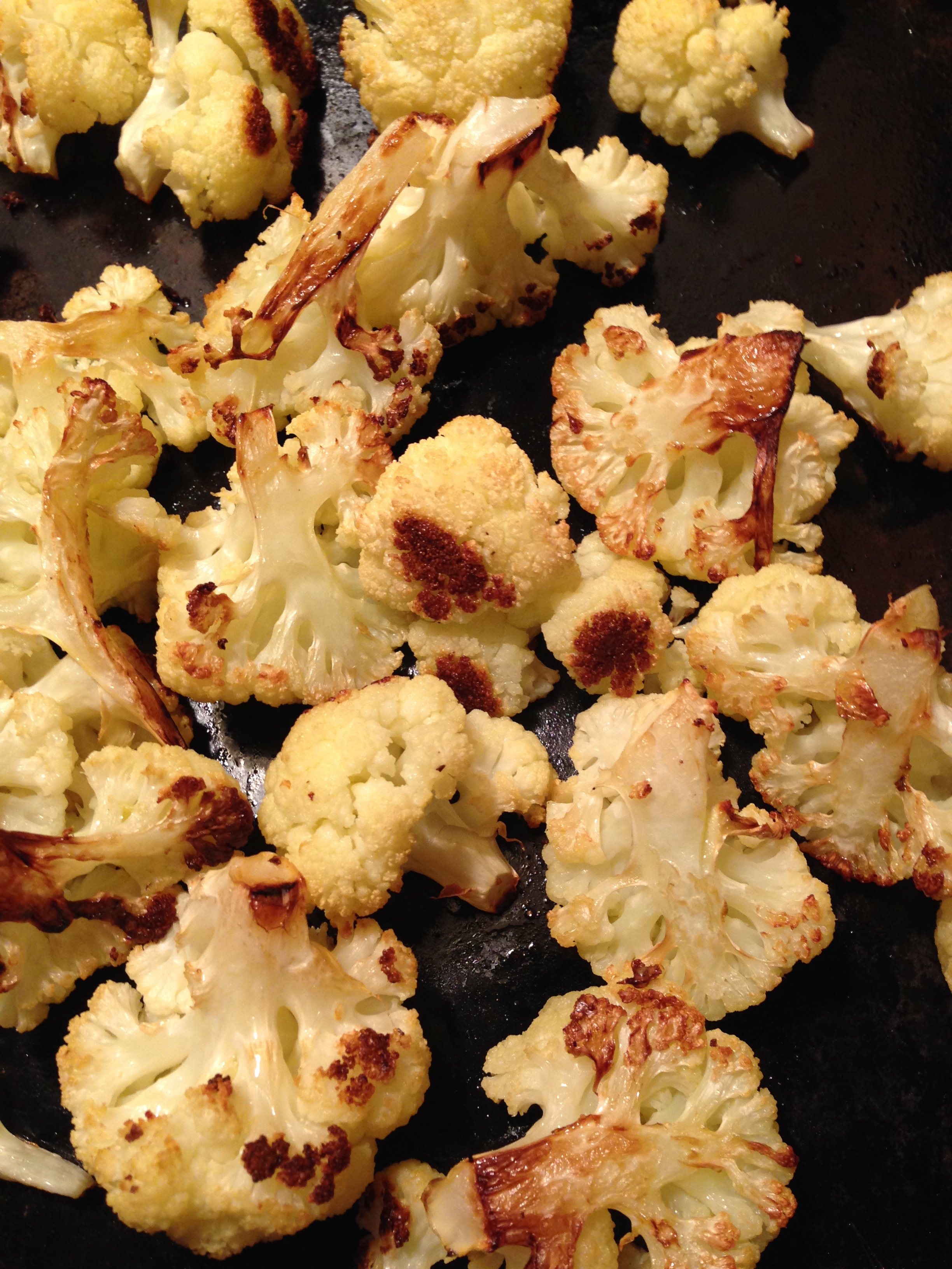I love roasted cauliflower. If you have never tried it, it is simple to make. Just wash your cauliflower and cut it into bite size pieces. Drizzle with olive oil, sprinkle it with salt, and put in a 400 degree F. Roast for about 12 minutes, turn the pieces over, and roast another 12-15 minutes. The combination of the caramelized vegetable and salt is addictive. On the rare occasions we have any leftover, they are a coveted snack…even cold.