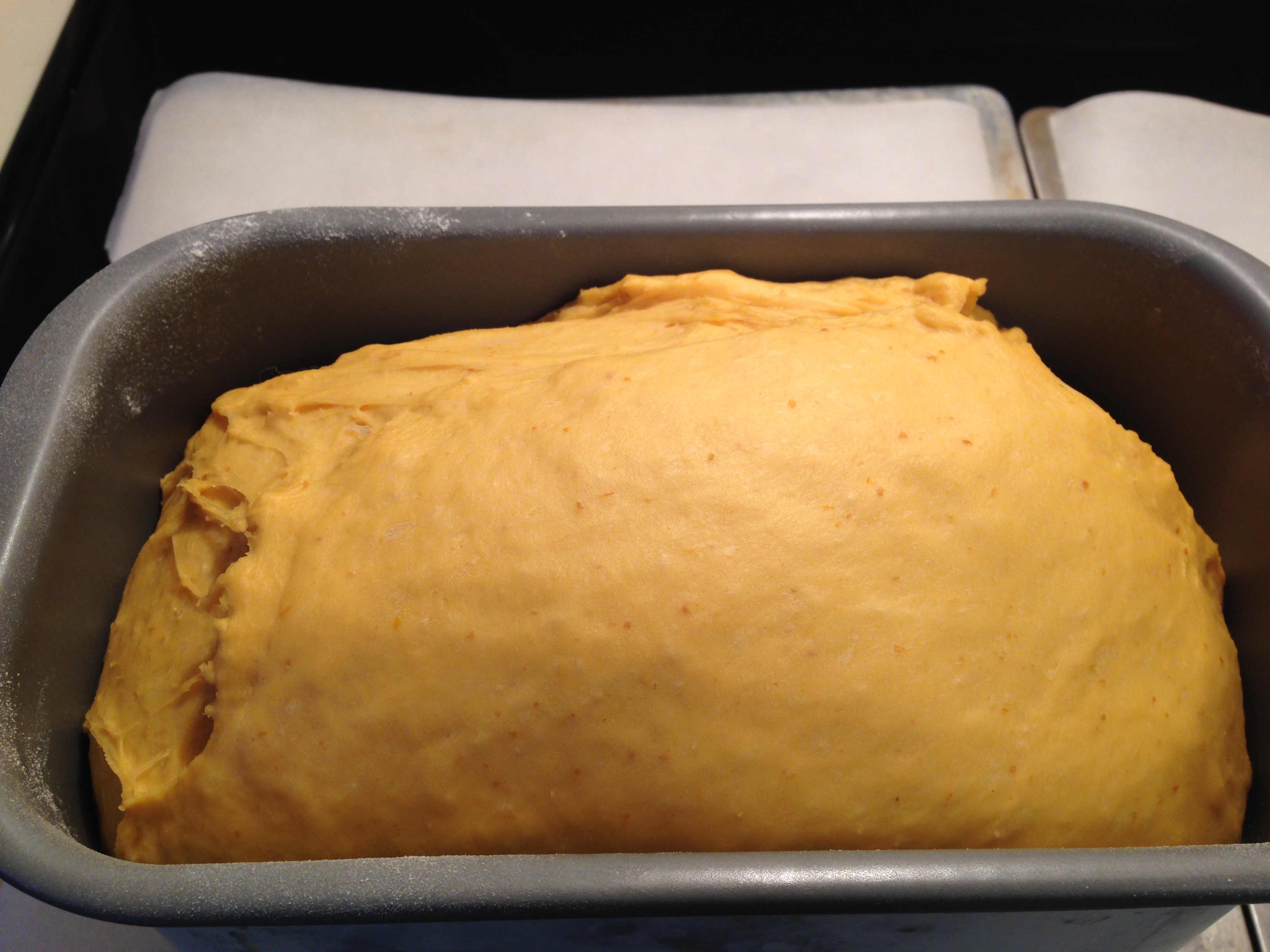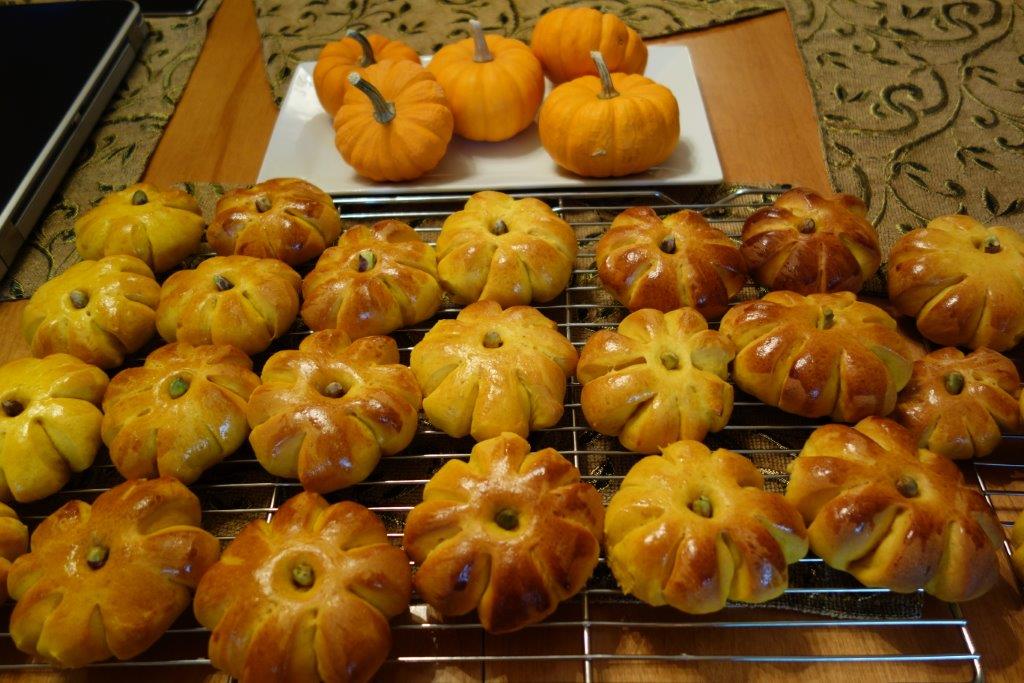 I have made these buns for Thanksgiving dinner for the past couple years and I really like them. They are golden and pumpkin-shaped, delicious, and add a festive touch to the dinner table. I also make them, formed in a standard bun shape, for school lunches in the fall season. I use the bread machine to make the dough, so that is the form of the recipe.