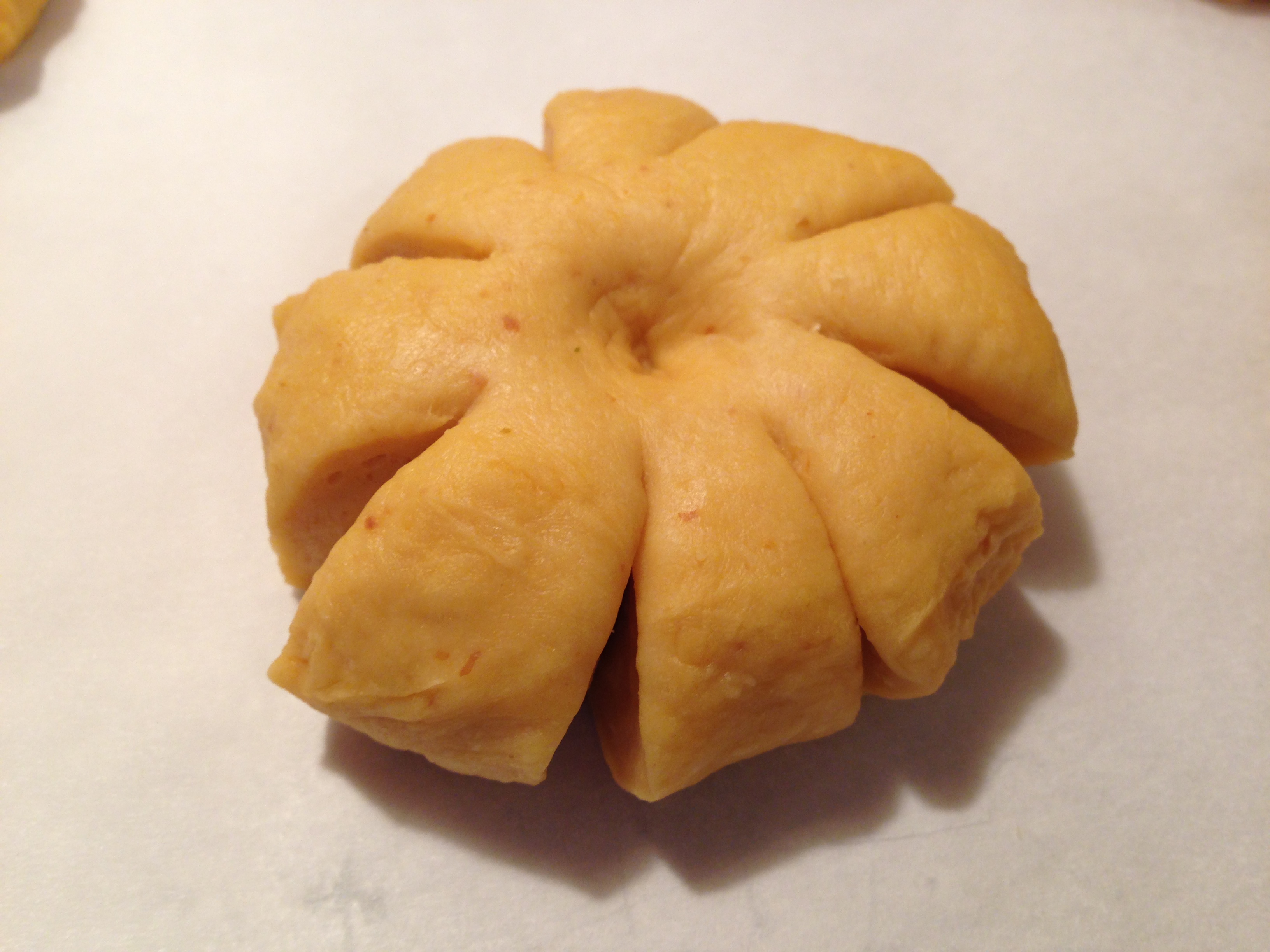 When the dough is ready, form into buns as normal and then flatten them slightly and make 8 cuts around the edge to form the lobes of the pumpkin, leaving the middle whole. Poke your finger in the middle to make an indentation that will form the spot for your pistachio “stem” later. Place them on parchment on a cookie sheet and set them to rise for 45 minutes. (I do this in an oven which I have turned on briefly to get the temperature up to 85 degrees F or so for good, draft-free rising.)