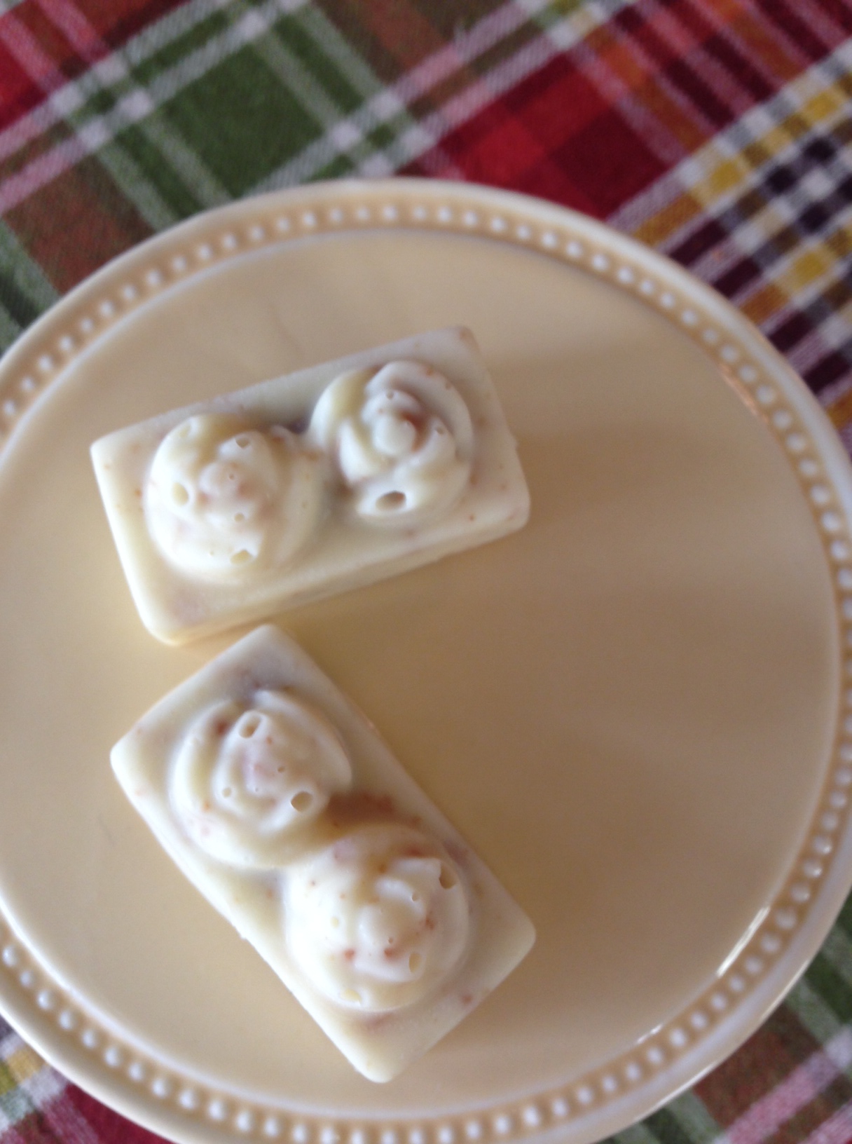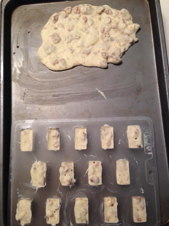 I just melted three Lindt white chocolate bars, removed the pot from the heat and stirred in the cookies that had been broken into smallish bits. I wanted the pieces big enough to be identifiable. I used chocolate forms for half of the batch and a sheet tray to make bark for the rest. I forgot to bang the air bubbles out of the forms, but they turned out pretty well otherwise. My daughter liked the forms best…more like getting a bar of choclate.