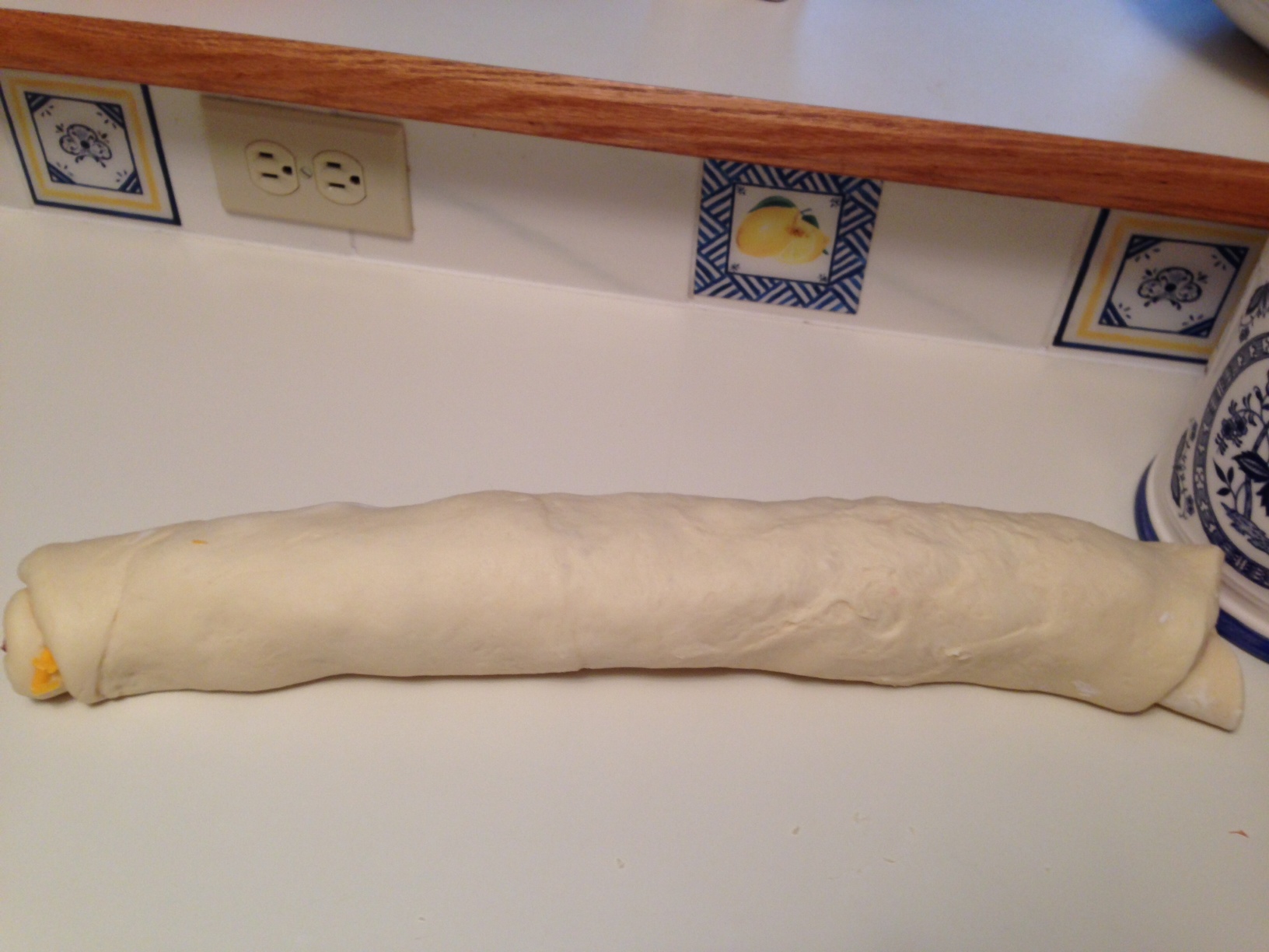 Roll out the dough about a half inch thick and spread with Miracle Whip (or butter) and mustard. Sprinkle the ham and cheese over the dough and roll up along the long edge. Slice dough into 1 1/2 inch slices and place on parchment paper. Preheat oven to 350 degrees F. Bake for about 20 minutes. These freeze well.