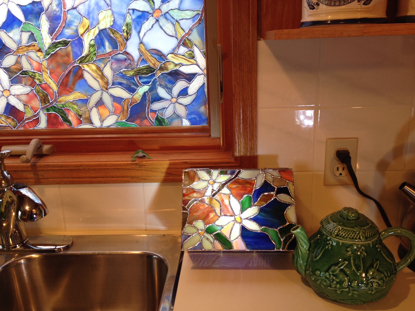 I am lucky to have a friend who is also a talented glass artist. When I asked her if she would make me a stained glass tea box that matched the window in my kitchen, this is what she created! It is beautiful, functional, and has the added bonus of reminding me of her with each cup of tea. Thank you, Dianne.