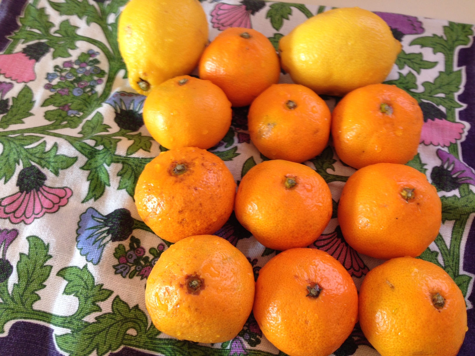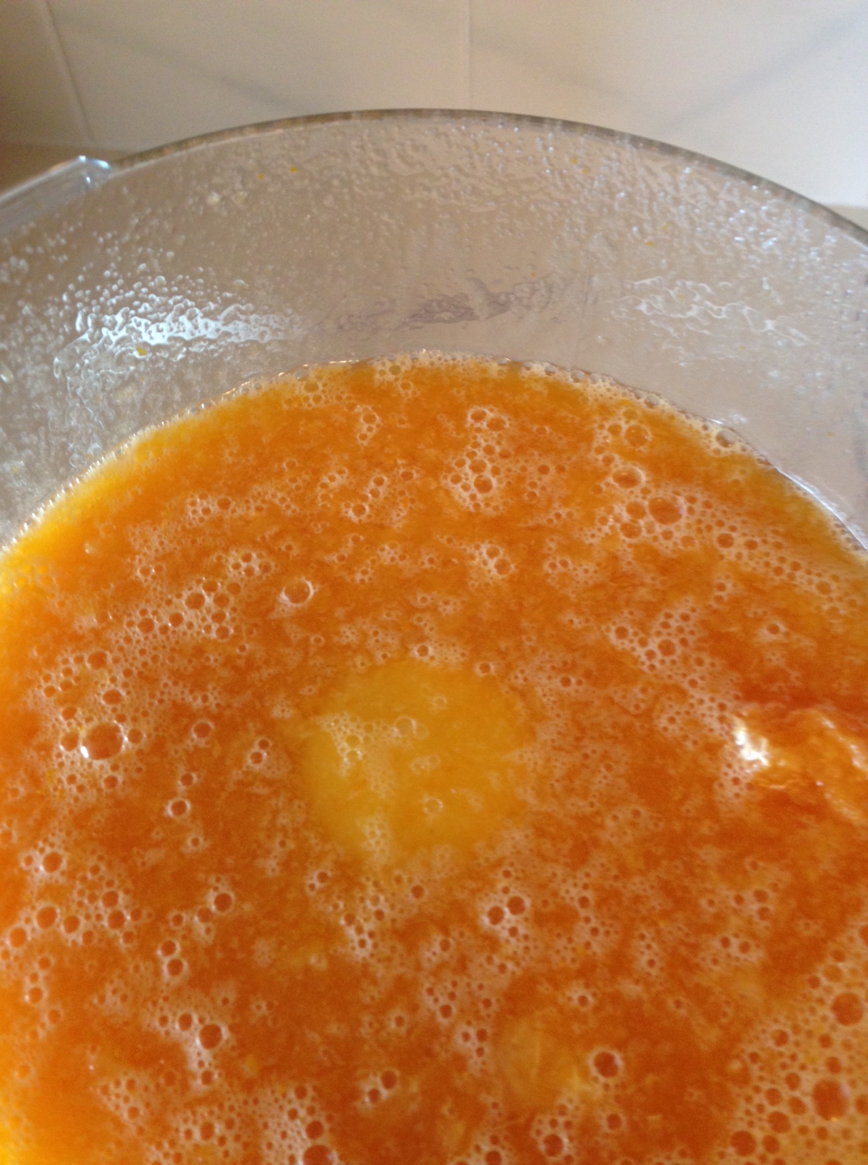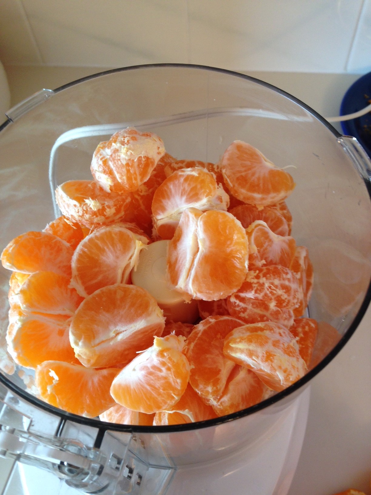 Finely grate about a tablespoon of zest from your mandarins and put in food processor with the lemon juice. Peel the oranges, removing as much of the white pith as possible. Compost the peels, and add the oranges to the processor, pulsing until well blended and fairly smooth.