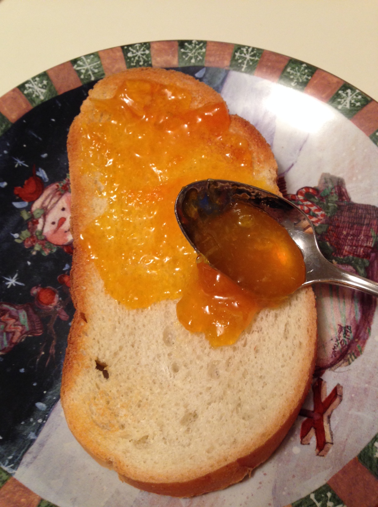 Transfer to a saucepan and bring to a boil over medium-high heat. Turn the heat down and simmer for about 30-45 minutes, until it sets. Keep a small saucer in the freezer to drop small spoonfuls upon – if you can run your finger through and it leaves a clean trail, it’s set. Skim off any foam.