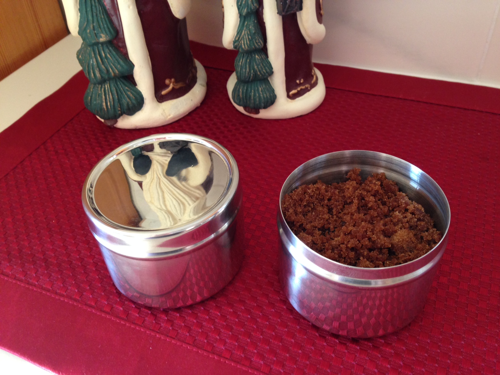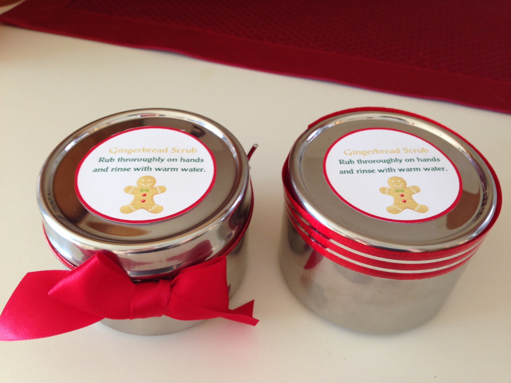This is a lovely thing to give as a hostess gift. It takes about 5 minutes to make from start to finish, and it smells divinely of gingerbread. It is also a nice treat for yourself when you are finished washing your piles of baking dishes, as it eliminates the winter dry skin we are plagued with at this time of year.