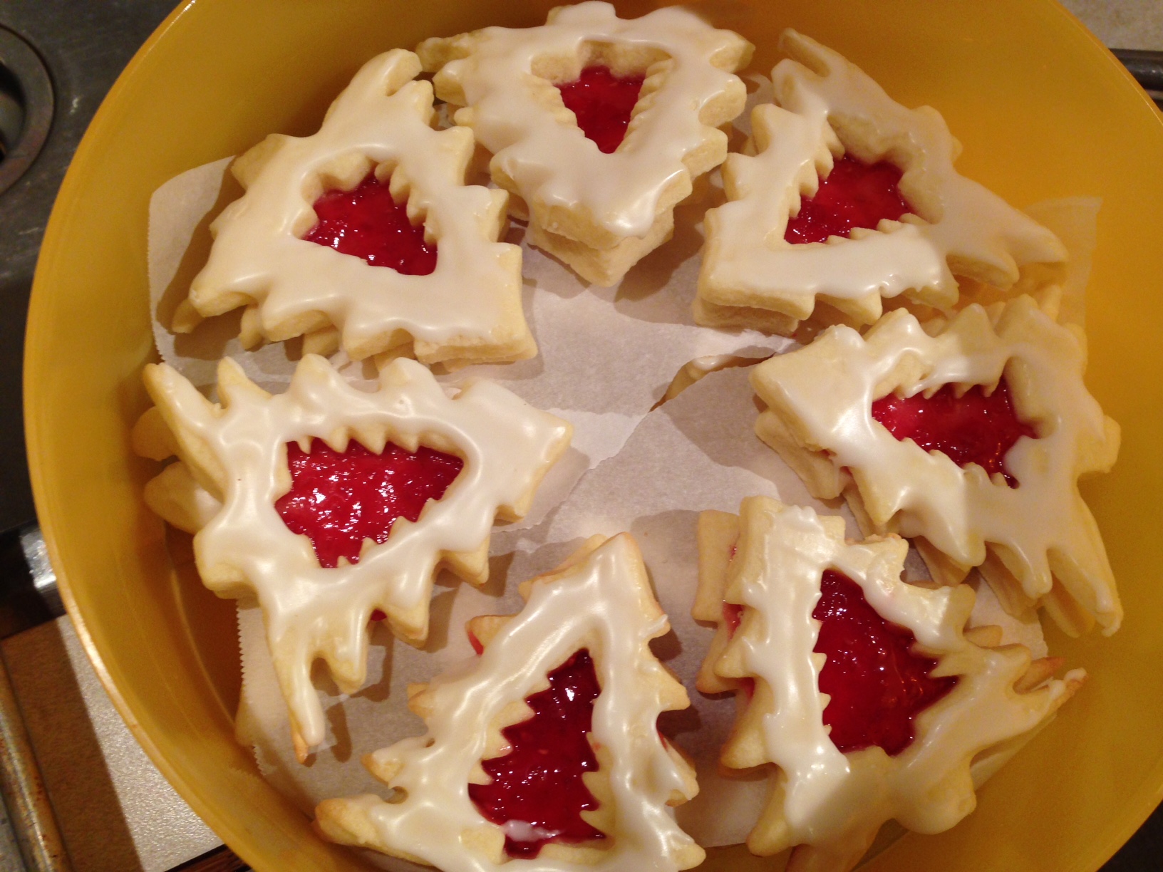 Bake for about 8 minutes at 350 degrees F. Ice the top cookie (the one with the shape cut out of the middle). Let dry. Smear jam on the whole cookie and put the iced cookie on top.