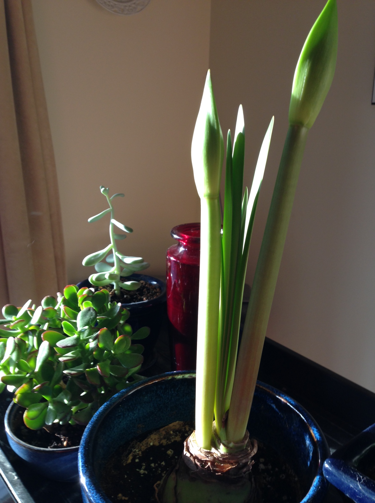 The progress of the amaryllis. Buds formed and shooting up quickly.