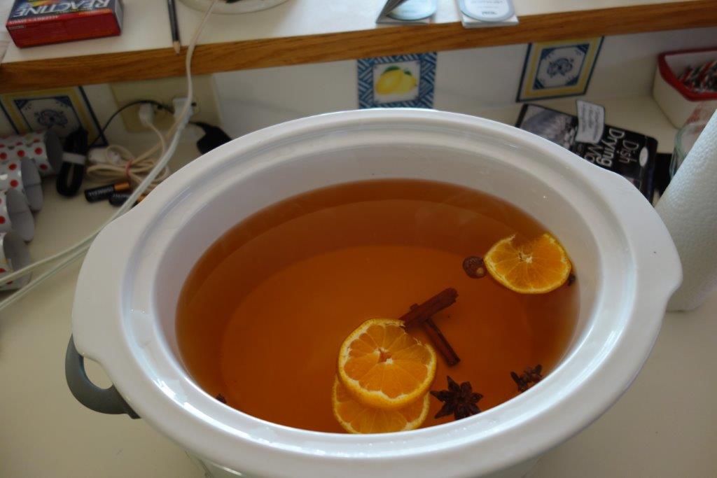 I like to make mulled apple juice in the slow cooker on Christmas morning. After it has simmered for a couple hours, I remove the spices to prevent them overpowering the apples. It makes the house smell wonderful, and we can return for another cup as wanted throughout the day.