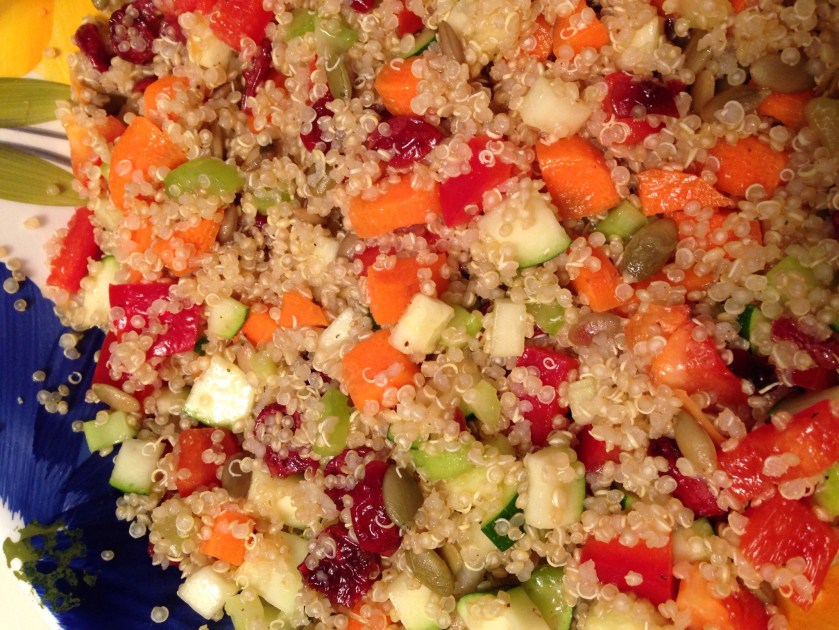 Cool at bit then add zest and juice of one lemon, and twice that amount of olive oil, mixing to coat all while still warm. Let cool completely then add chopped peppers, zucchini, green onions, carrots, dried cranberries, feta cheese, almonds etc. as desired.