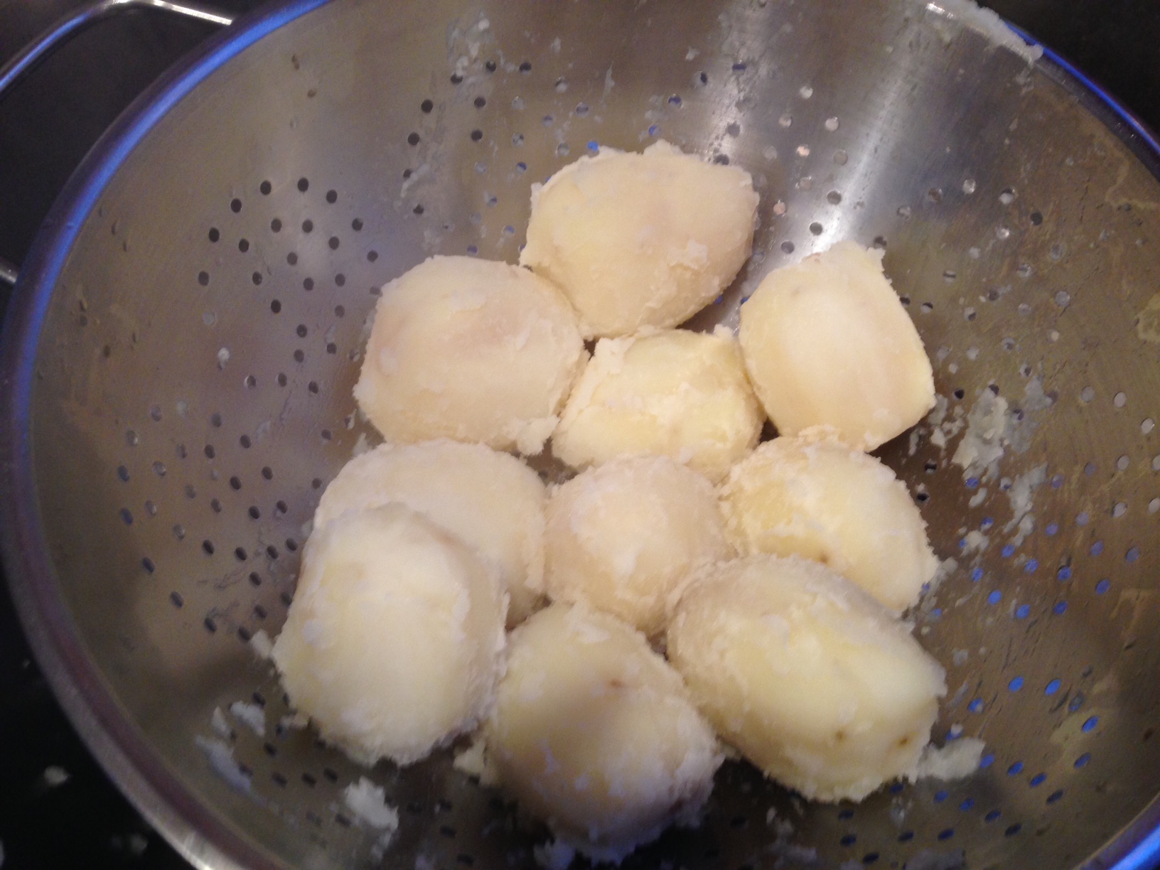 Drain potatoes and toss in the colander to rough up the edges a bit. Let them sit in the colander until they stop steaming and are somewhat dry.