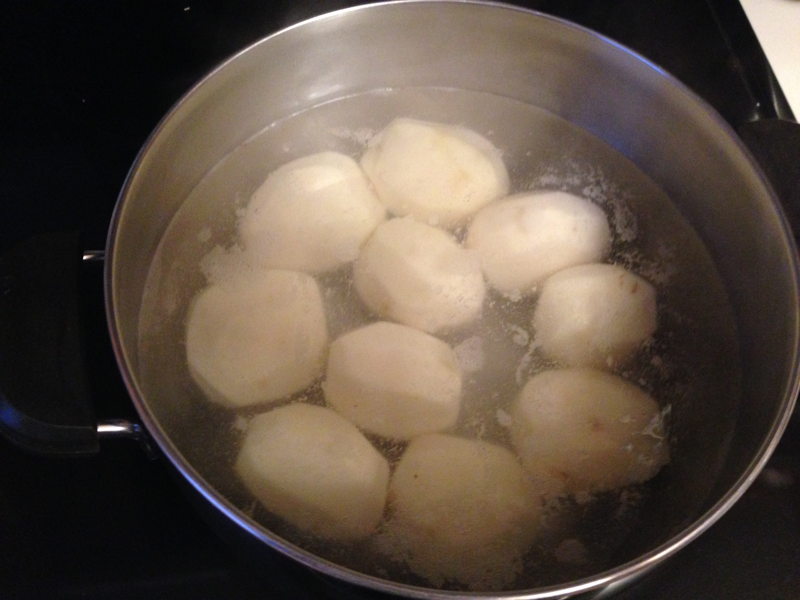 Bring well-salted water to a boil. Peel potatoes, cutting them in half crossways if they are very large. Add potatoes to the boiling water for 10 minutes to par broil them. (You don’t want them cooked all the way through).