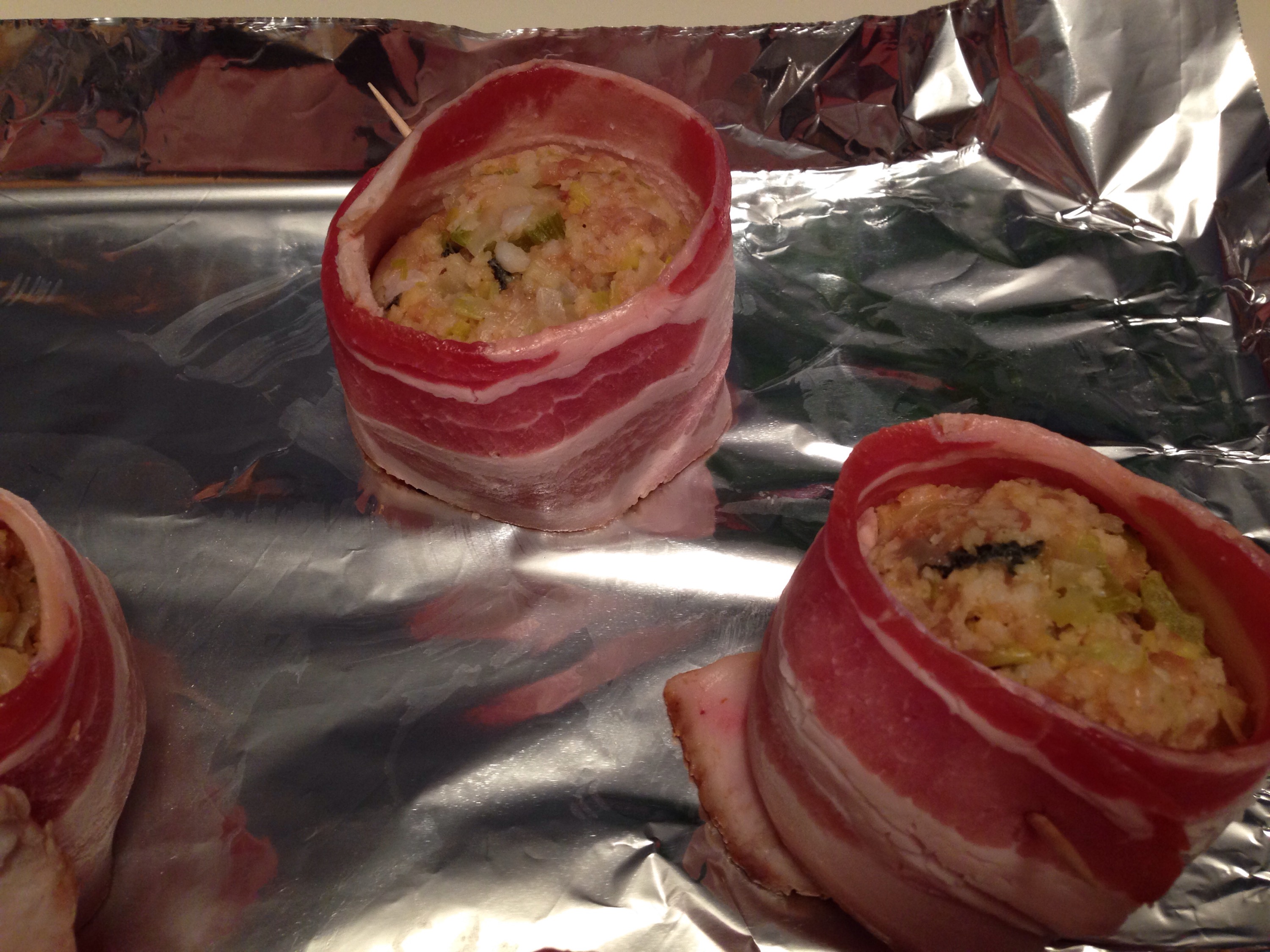 Preheat oven to 375 degrees F. Sauté the onions, celery and leeks in a pan until they are soft. Let cool. Mix with everything else, except the bacon, and form into 14 balls. Wrap bacon around each ball and secure with a toothpick. Cover them with foil and bake for 15 minutes. Remove the foil and bake another 30-35 minutes.