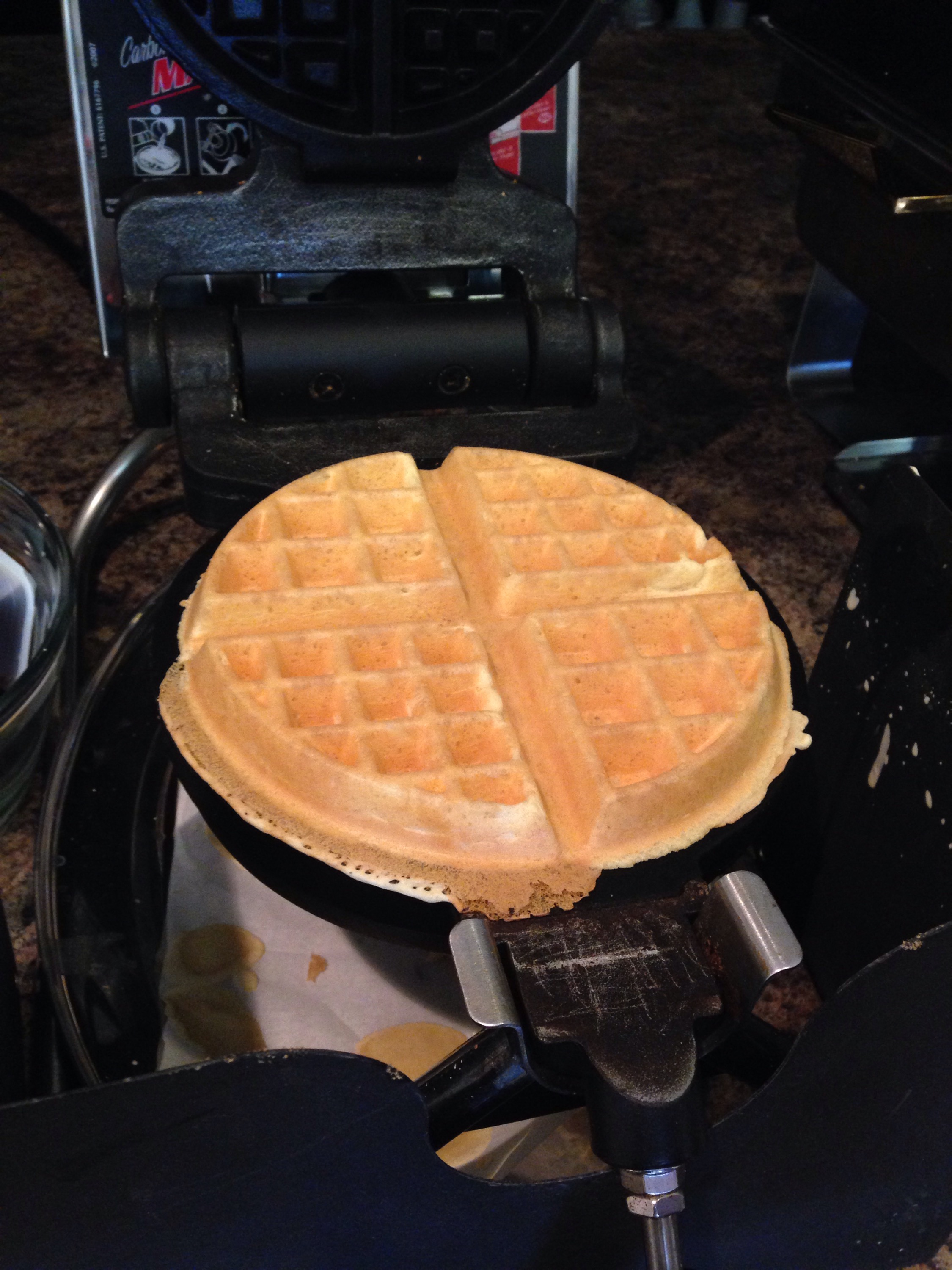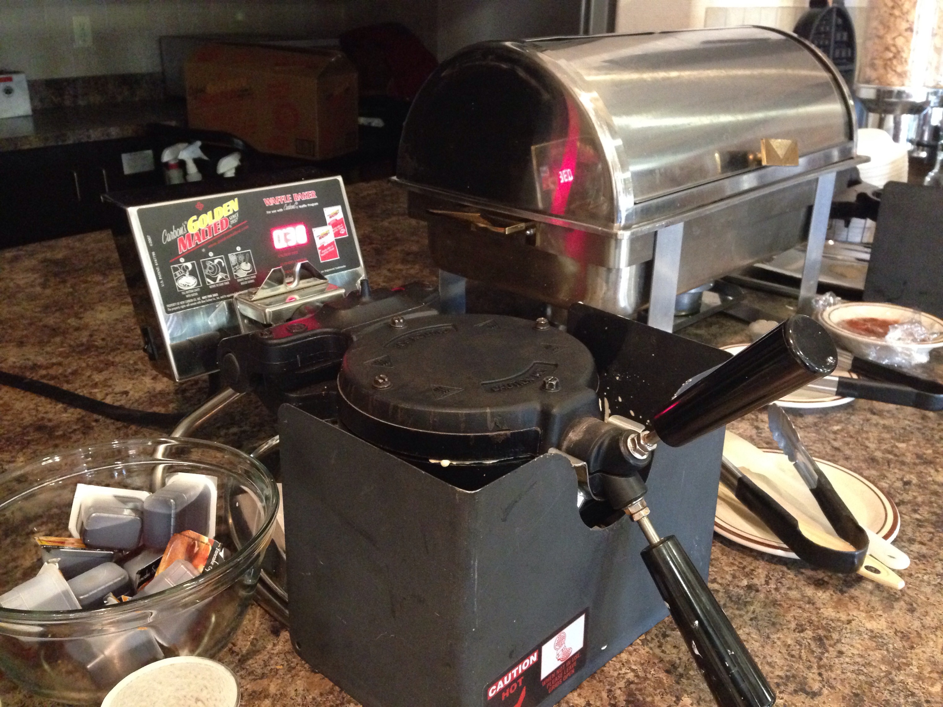 I don’t often stay in hotels, but recently discovered that complimentary breakfasts no longer mean toast, cereal, yogurt and muffins. I love the novelty (to me) of this very cool waffle-maker we encountered. You pour a cup of batter from the hopper onto the iron. Wait a minute or two, flip, and wait another little bit. It added some zip to my morning 🙂