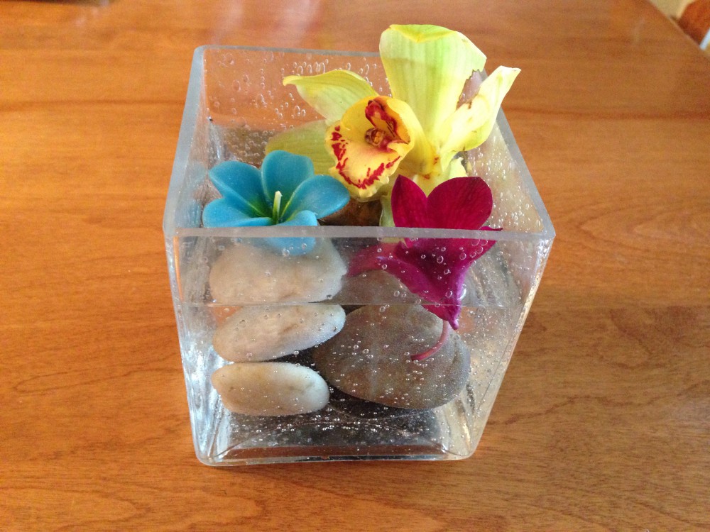 Just put some rocks in a vase, and add a floating candle. You can add flowers too if you have some around.