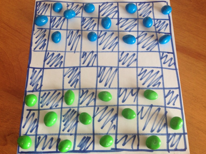 Our Easter M$M”s offered great entertainment in the form of an impromptu game of checkers. We used the blue and green as our main colours, and crowned with yellow and orange. Players ate the pieces they jumped.