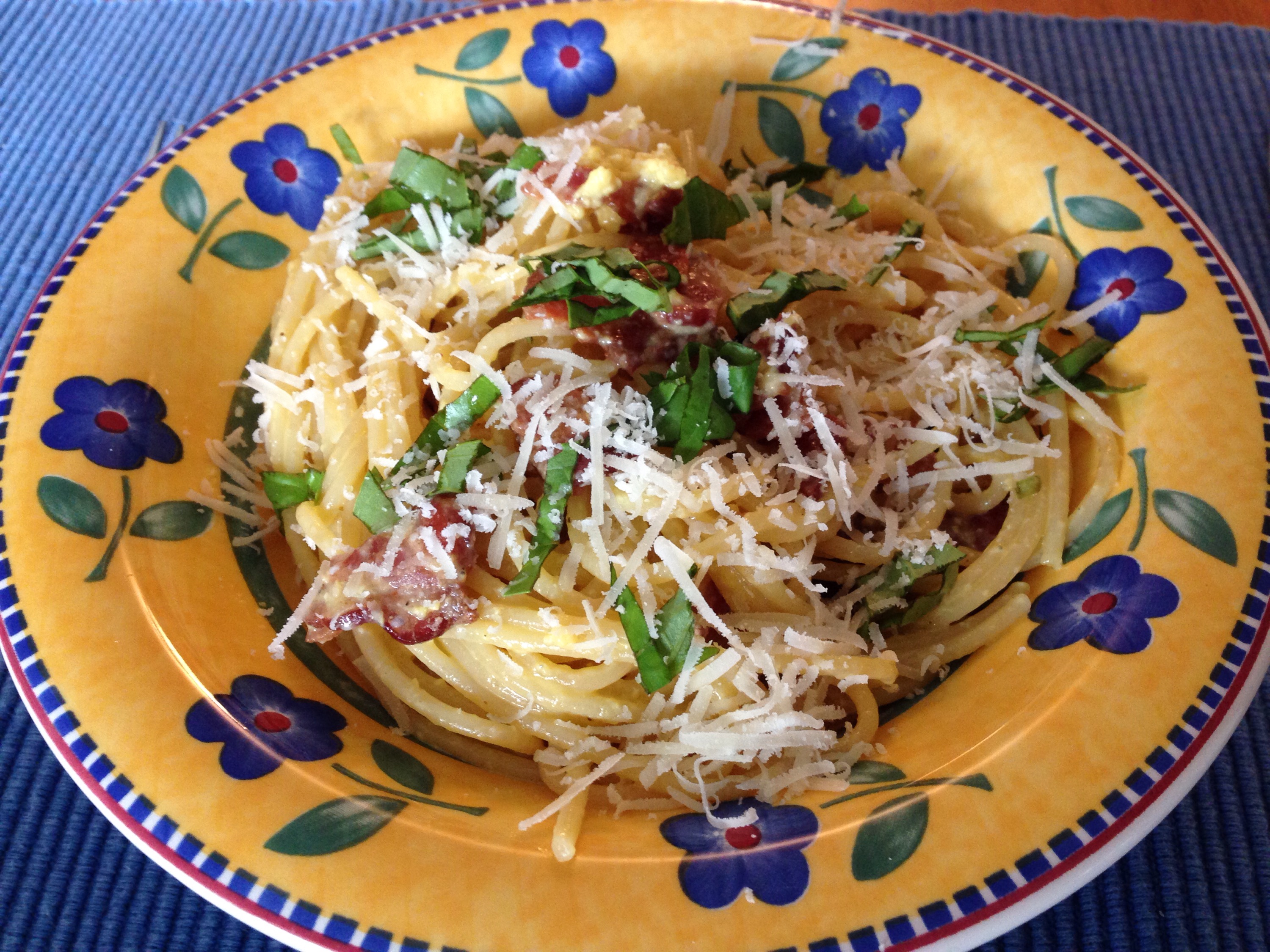 – Stir in the bacon and basil. Sprinkle with the remainder of the parmesan cheese. Enjoy!