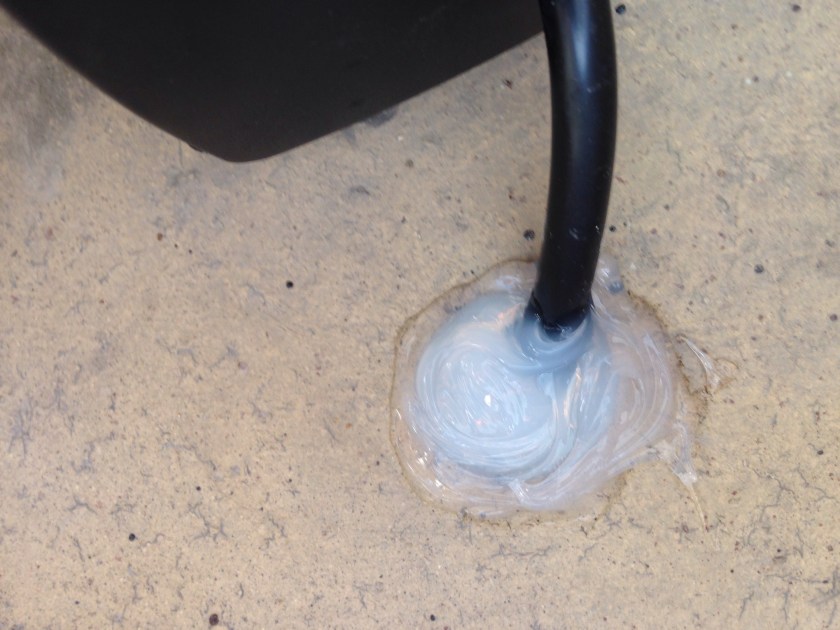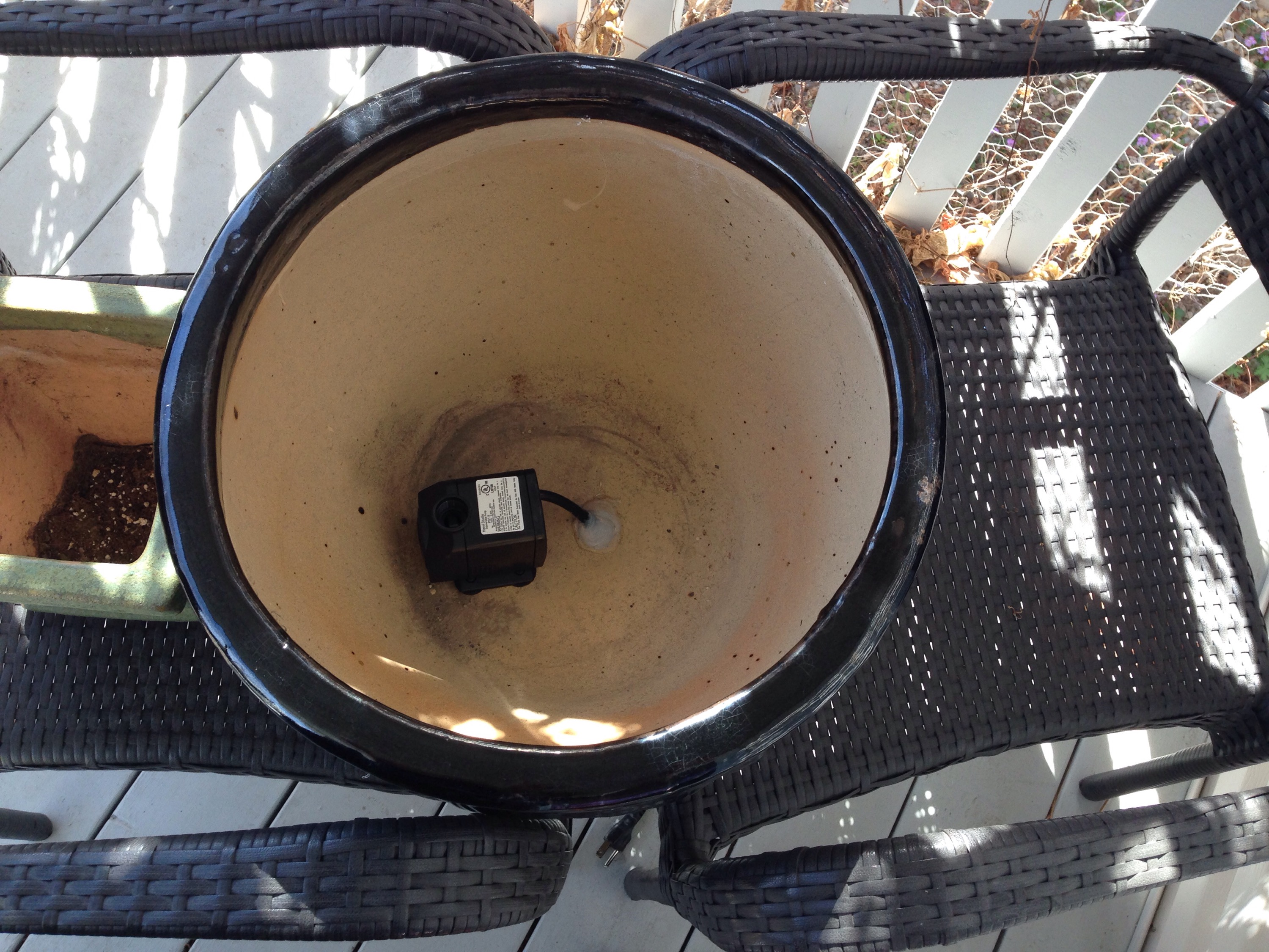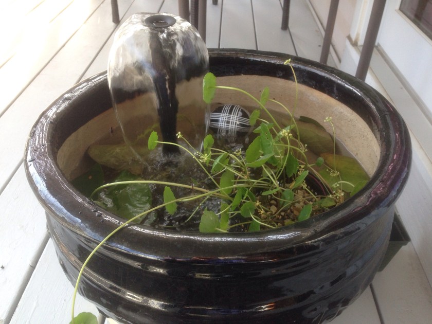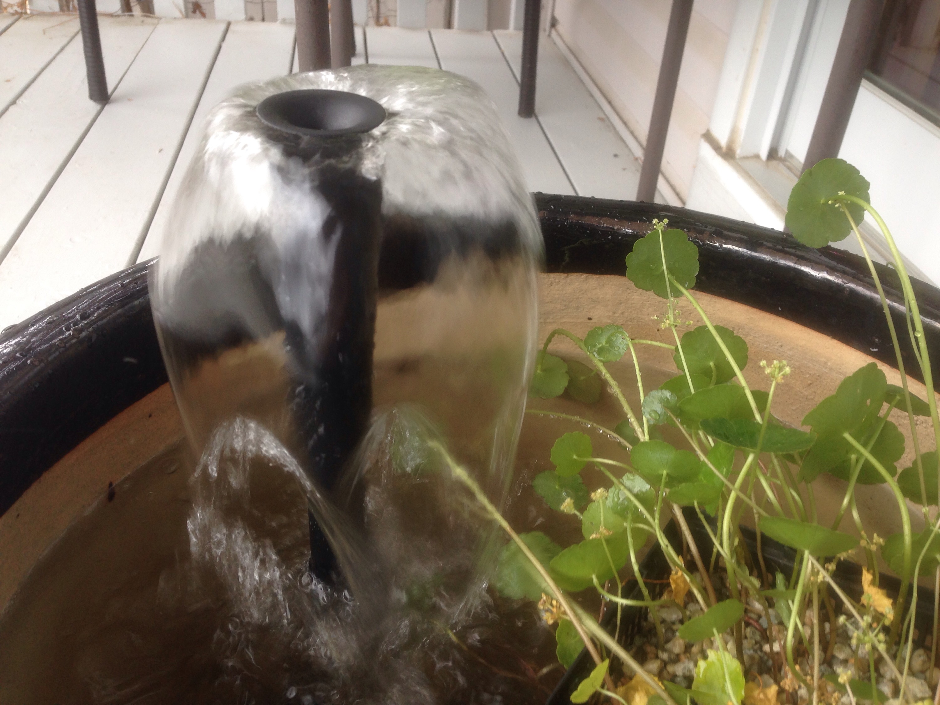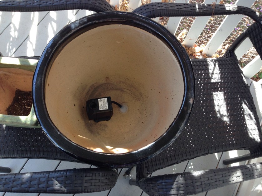 I let the silicone cure for 3 days, placed the pot on wooden blocks so the cord has a place to go underneath the pot, and put in enough water to cover the pump. Voila! I also added a water plant (Pennywort) hydrocotyle vulgaris. I want to find a water lily and some rocks as well, but I am well-chuffed at the result so far.
