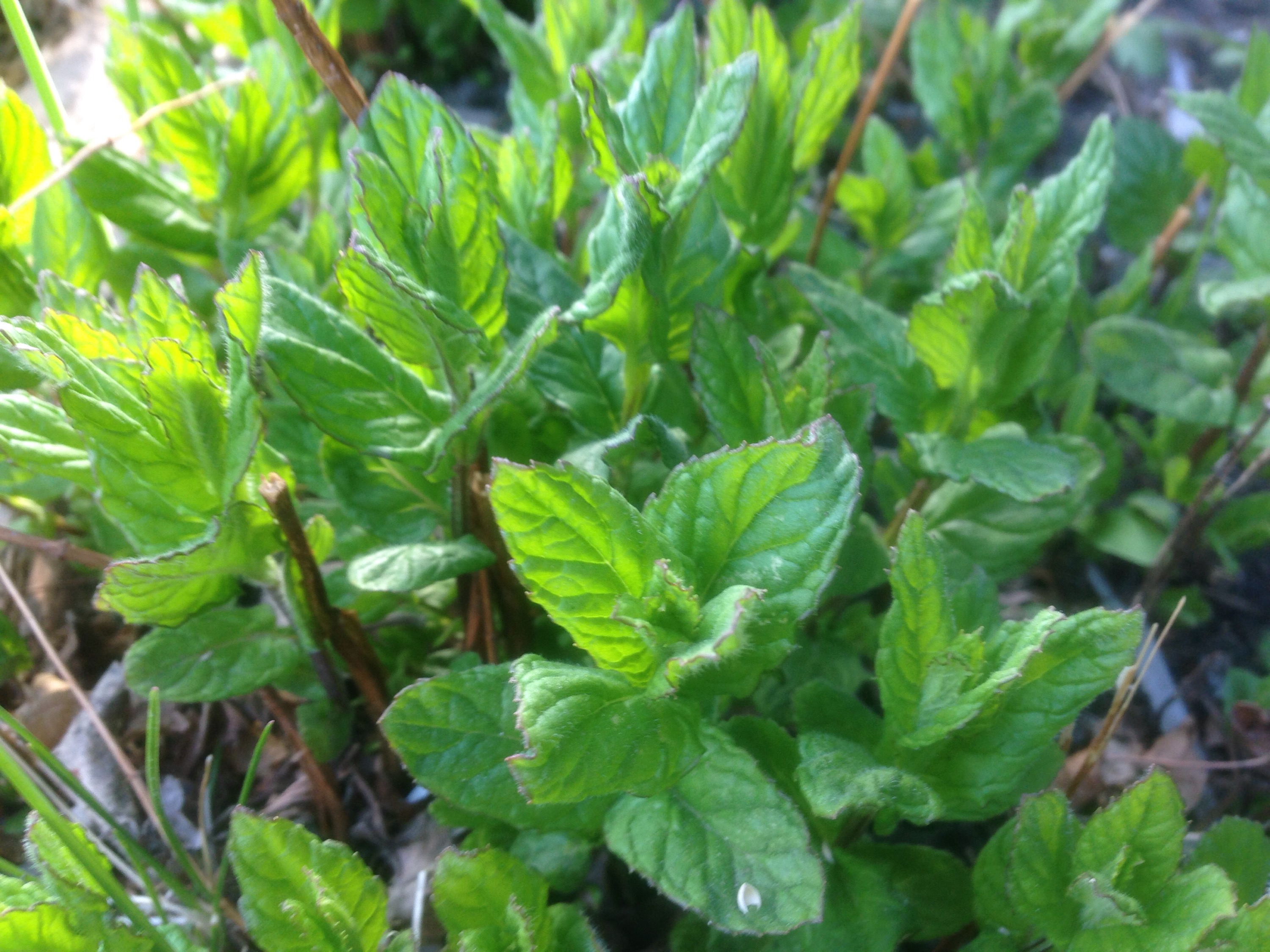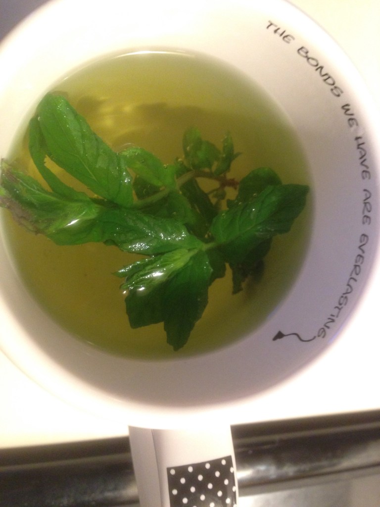 When the mint is tall enough to pick sprigs, I make fresh mint “tea”, which is not tea at all, but an infusion of mint into hot water. With or without a little swish of honey, it is delicious and refreshing. The aroma is fresh, minty, green and clean. I love it!