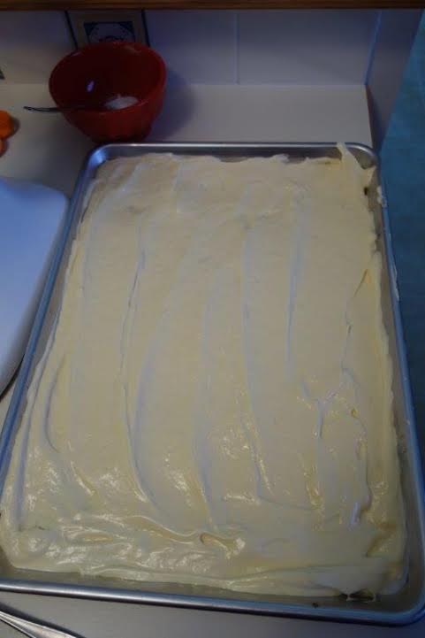 Put parchment paper in the bottom of a 15x10x1 inch cookie sheet. Spread the batter evenly. Bake at 375 degrees Farenheit for 12-15 minutes or until done.