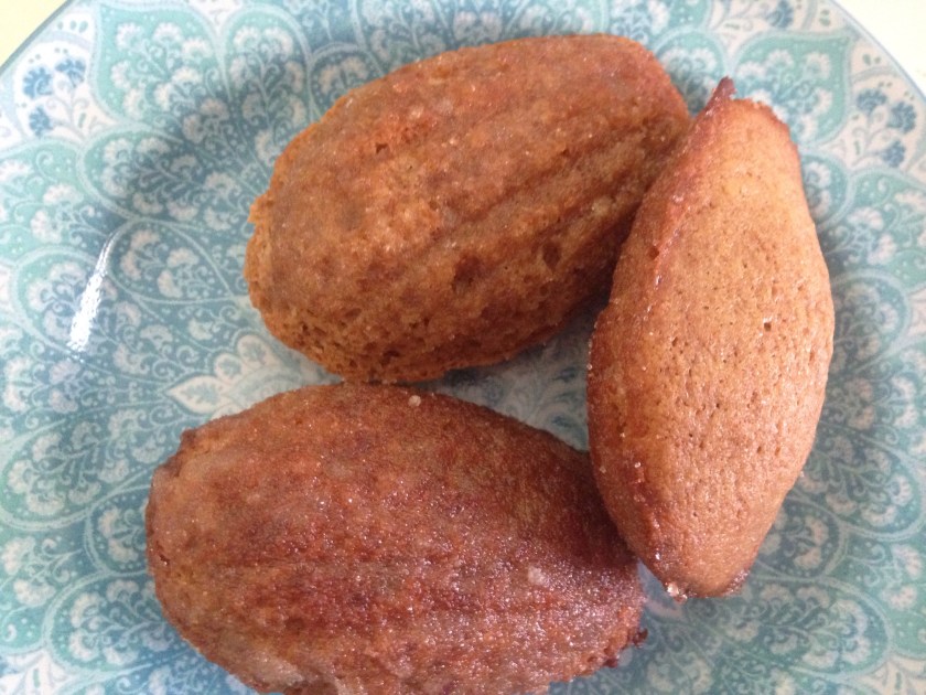 In three batches, gently fold the flour mixture into the egg mixture. Add the cooled coffee to the melted butter. Fold in the butter mixture. Fill pan indentations 3/4 full. Put into the oven and turn the oven down to 400 degrees F and bake for 6 minutes. Turn down the oven to 350 degrees F and bake for another 6 minutes or until toffee brown. Remove to racks.