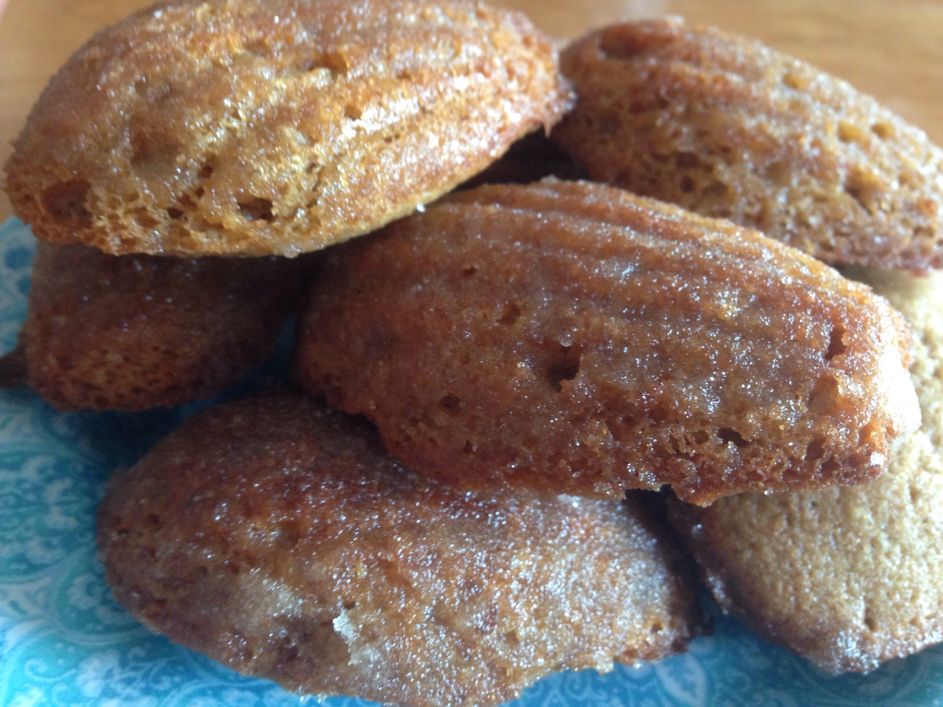 In three batches, gently fold the flour mixture into the egg mixture. Add the cooled coffee to the melted butter. Fold in the butter mixture. Fill pan indentations 3/4 full. Put into the oven and turn the oven down to 400 degrees F and bake for 6 minutes. Turn down the oven to 350 degrees F and bake for another 6 minutes or until toffee brown. Remove to racks.