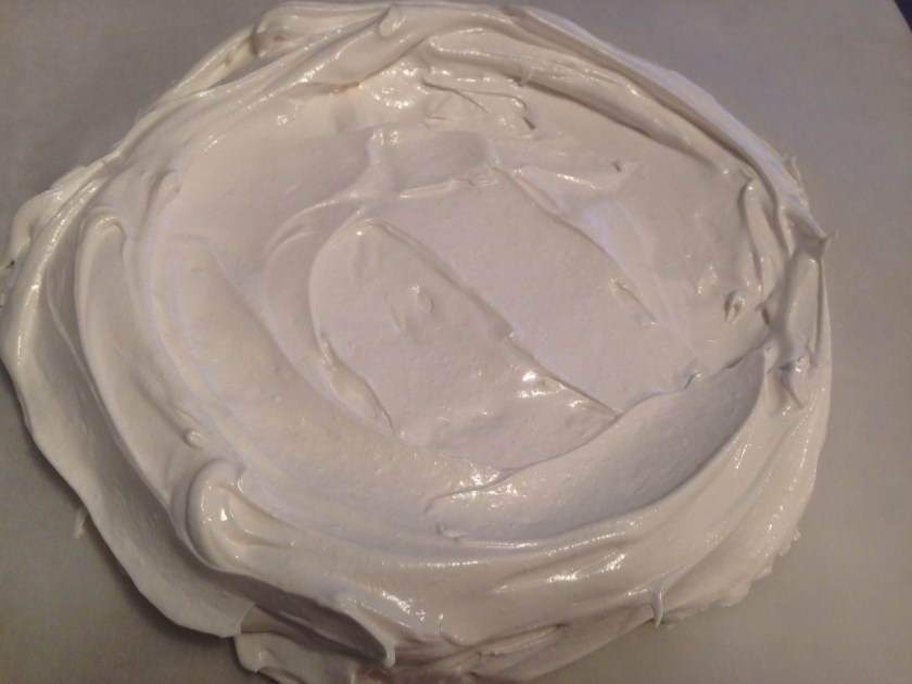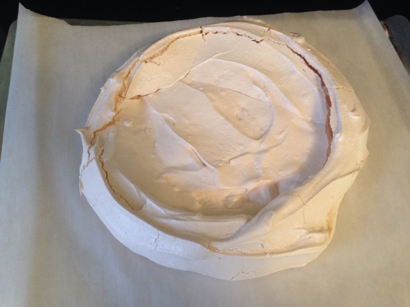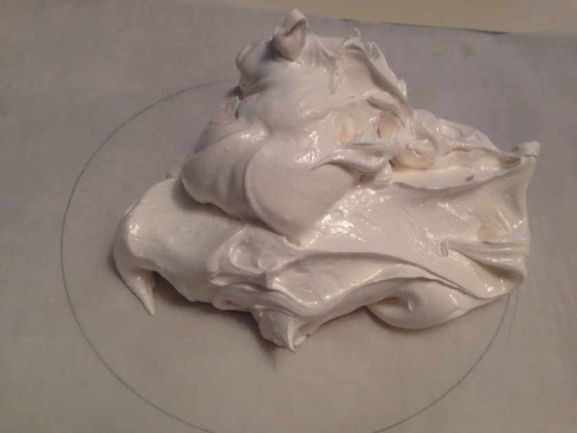 Let whites come to room temp. Add vanilla, cream of tartar and salt. Beat until soft peaks form. Gradually add the sugar, beating until stiff peaks form. Spread the meringue over circle using a spoon, making a shallow bowl shape.