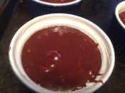 Add the flour and the chocolate to the eggs. Divide batter in half. Evenly portion the first half into the three ramekins. To each one, add a spoon of peanut butter in a mound in the center of the dish.