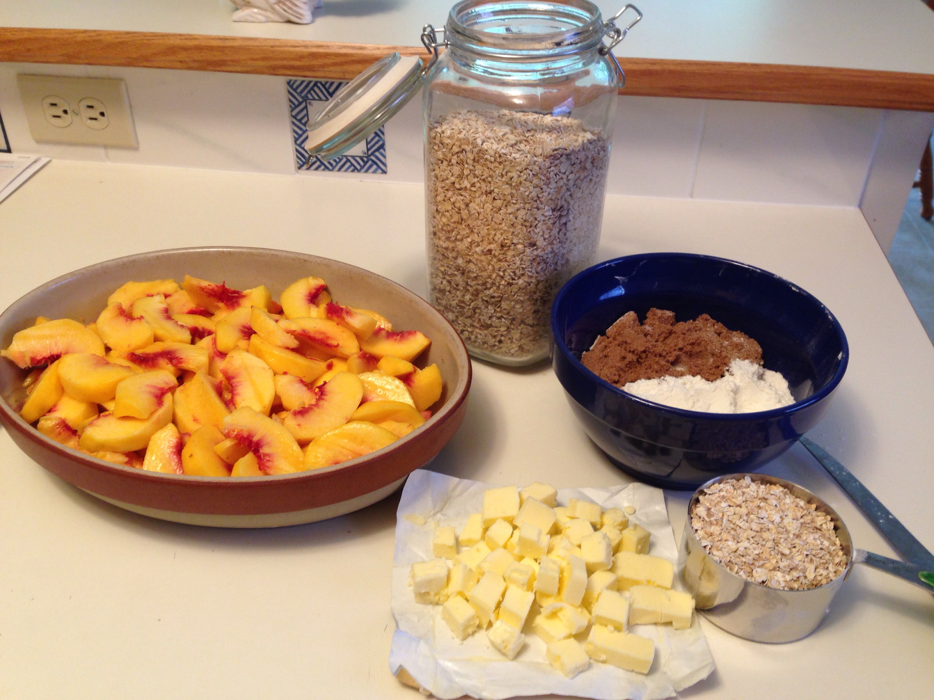 Squeeze together with your hands until well combined. Spread over peaches. Bake at 375 degrees Fahrenheit for 45 minutes.