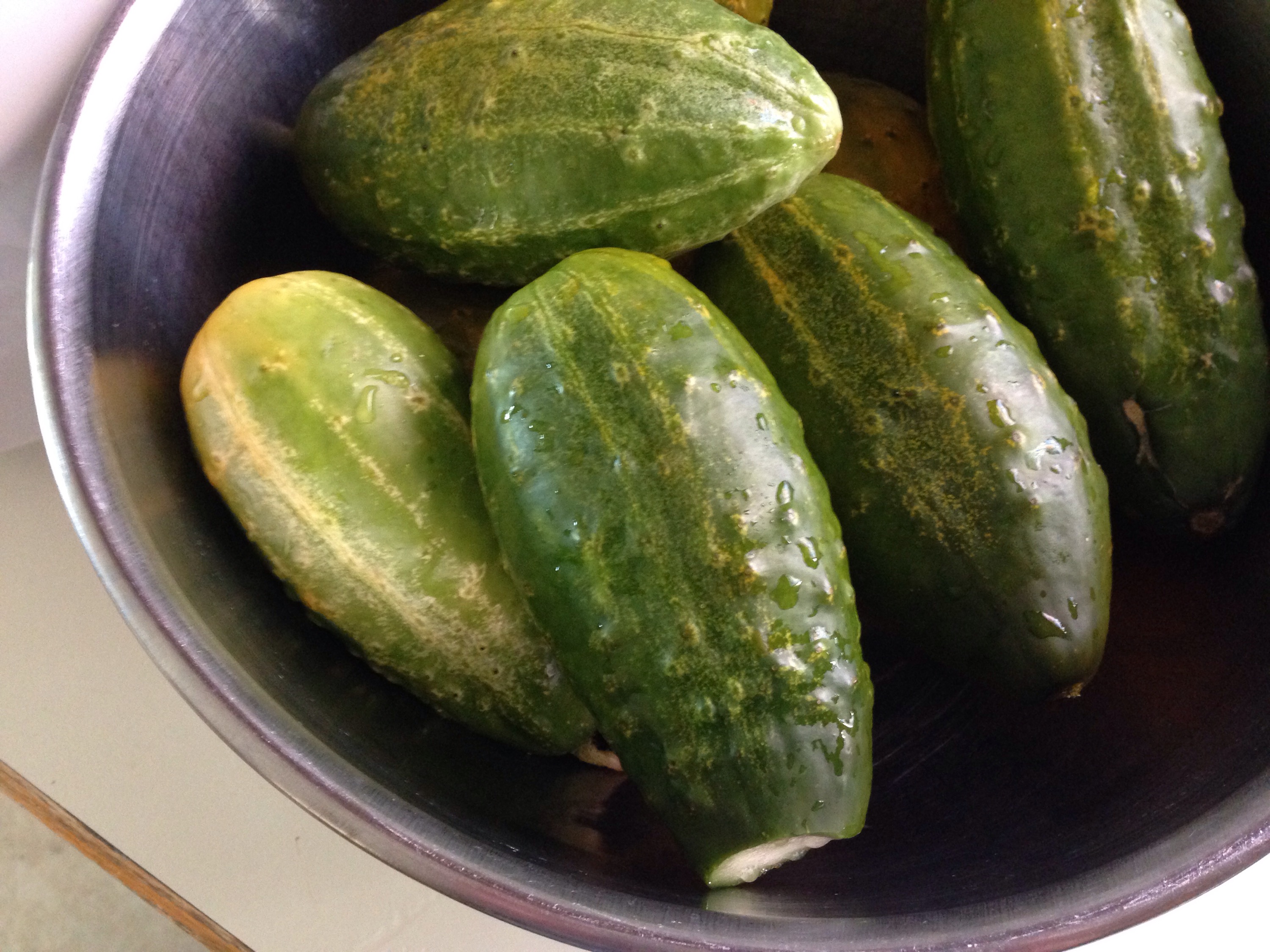 Scoop the seeds out of any oversized cucumbers, and leave the small ones as they are. I grated them with the grating wheel on my food processor and was very happy with the size of the pieces, but a box grater does the same thing. Grate the onion as well. Put the grated vegetables into a bowl and sprinkle the 1/4 cup of salt over them, mix it and let it sit for half an hour.