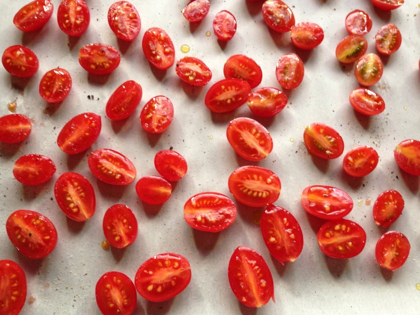 Cut tiny tomatoes in half lengthwise. Spread them out on parchment paper on a cookie sheet, brush with olive oil, and sprinkle with salt and pepper. Bake in a 250 degree F oven for a couple of hours (this batch took 2.5 hours as they were especially juicy tomatoes) until they are mostly dry. Cool and enjoy!