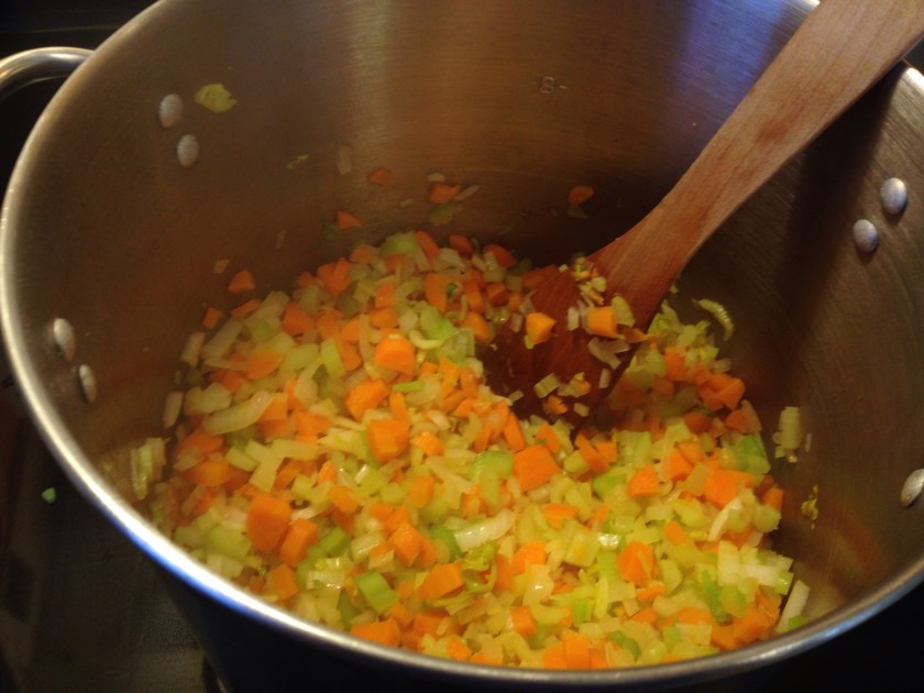Add oil to the pot and sauté the vegetables until starting to soften. Add the wine and herbs. Add the crushed tomatoes and let the pot simmer for couple of hours.