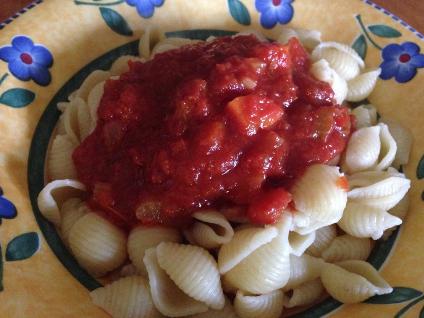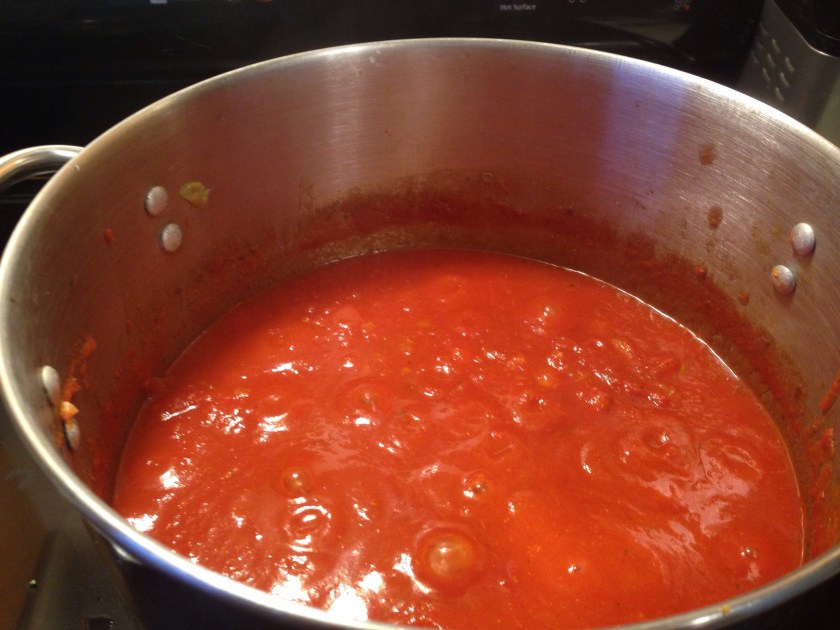 This is a big batch sauce that I make to package and store in the freezer. It is a good pasta sauce as is, but makes a really great sauce for making lasagna. For lasagna, I remove Italian sausages from their casings and fry them to add to the sauce and use this as the “red” layers between noodles.