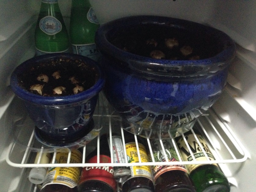 This year I planted Prince Claus in the small pot, and Pickwick in the large one on September 26. That means they should be ready to come out of the fridge around December 19th. They should then bloom in January, when all the Christmas decorations are put away and the house is wanting some cheer. 🙂