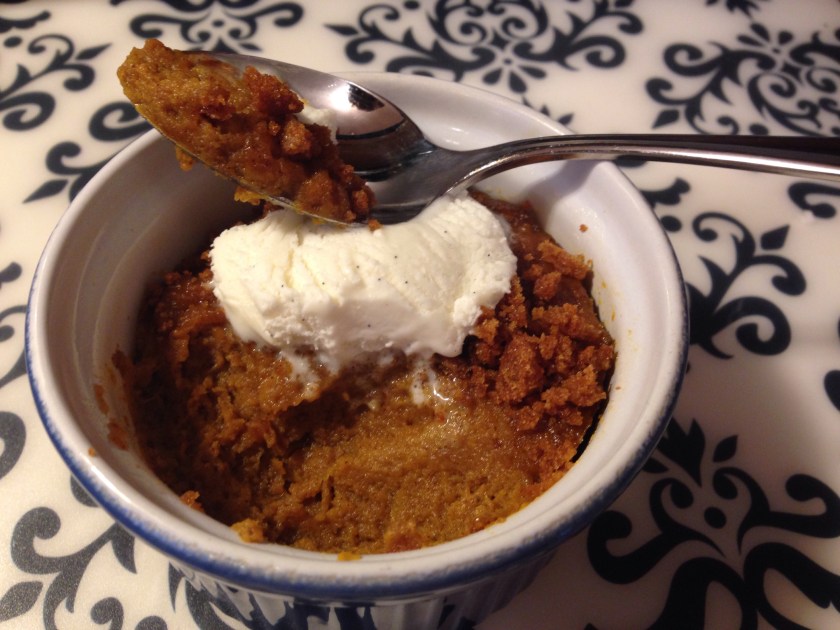 Combine all and mix well. Grease ramekins and fill with pumpkin mixture. Bake at 350 degrees F for about 30 minutes. You can serve it plain, with pouring cream, ice cream, gingersnap crumbs, or a slice of chocolate. We like it best served warm, but cold is good too.