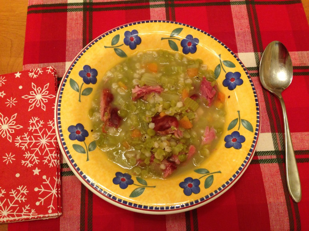 Add to a large pot. Bring to a boil, then turn down and simmer 2-3 hours, until the peas are soft. Remove hock from pot. Take the meat off the bone, chop it, return it to the soup. Voila.