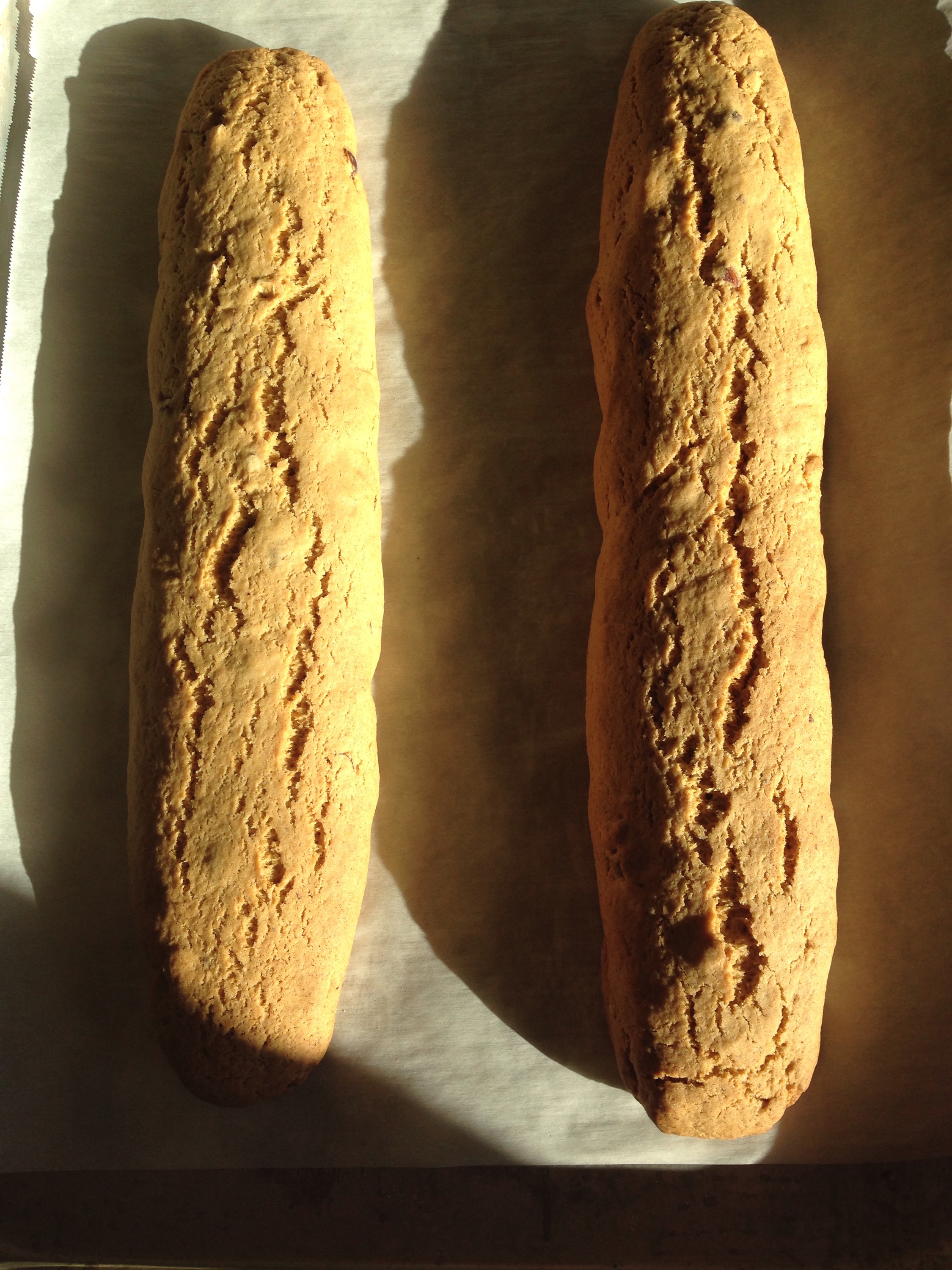 Divide dough into 4 pieces. Shape piece into 9x2x1 ½-inch logs. Place logs 4 inches apart on two cookie sheets with parchment. Bake logs in a 375 degree F oven for 25 minutes. Cool on sheet 30 minutes.