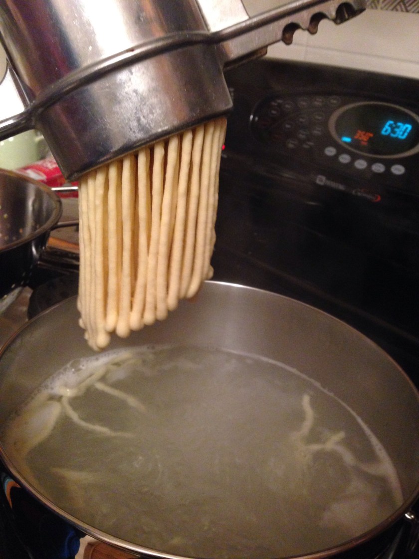 Squeeze portions of the dough through the press (or cut off thin bits in the boiling water using a small cutting board and a knife). Dunk the press into the water to get noodles to drop into the water. They don’t need long to cook. Three minutes or so.
