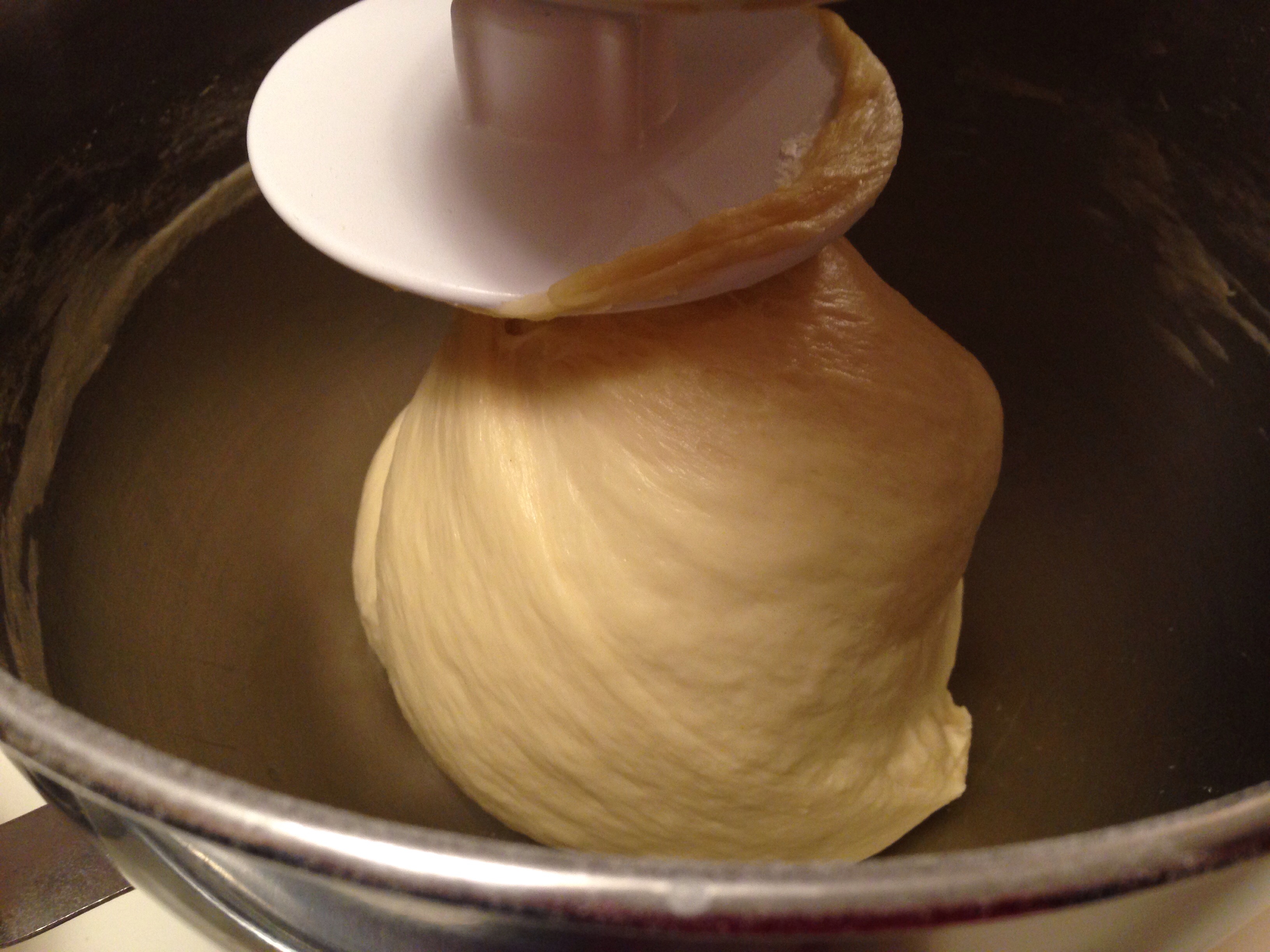 Mix with dough hook till very elastic. I let my mixer run about 20 min.