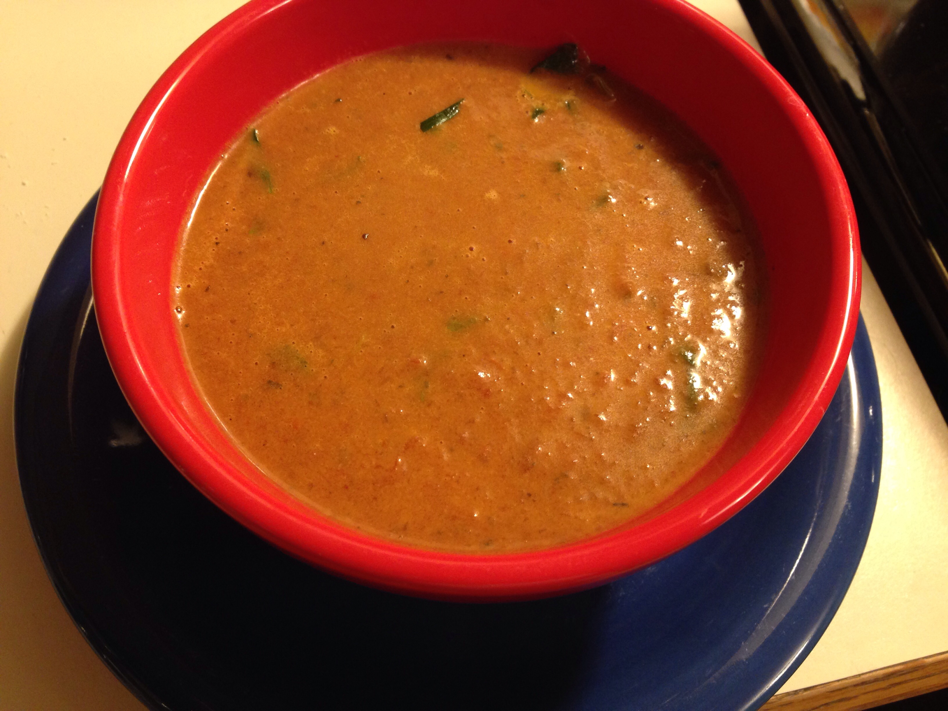 I love a fresh tomato soup, but in the dead of winter, where’s a girl to find a ripe tomato? As an alternate, I enjoy the deep tomato flavours the sun-drying process produces. This is a “pantry soup” of the simplest kind. (I added fresh basil to this batch, but would not do it again as it doesn’t blend well)