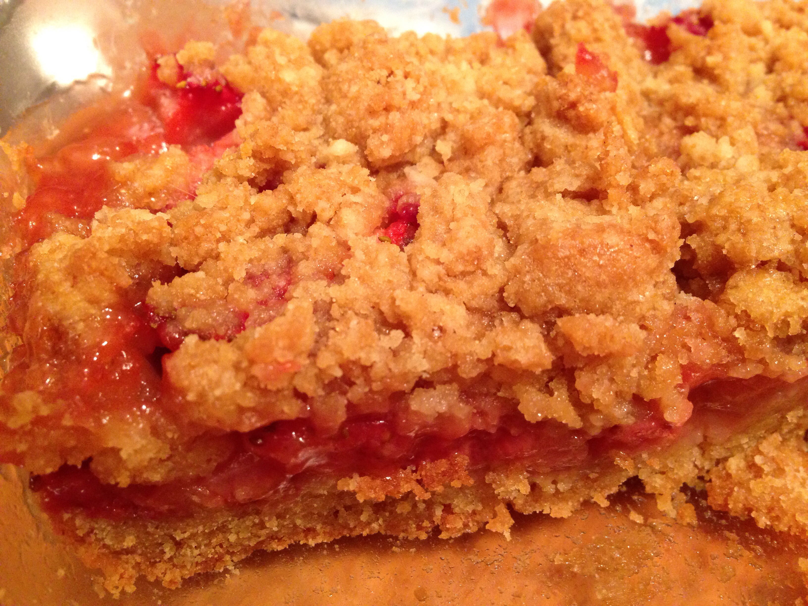 Grease a 9×9 pan and press 2/3 of the flour mixture into the pan as the crust. Add the strawberry filling. Top with the final 1/3 of the flour mix. Just crumble this over the top. No need to press it.