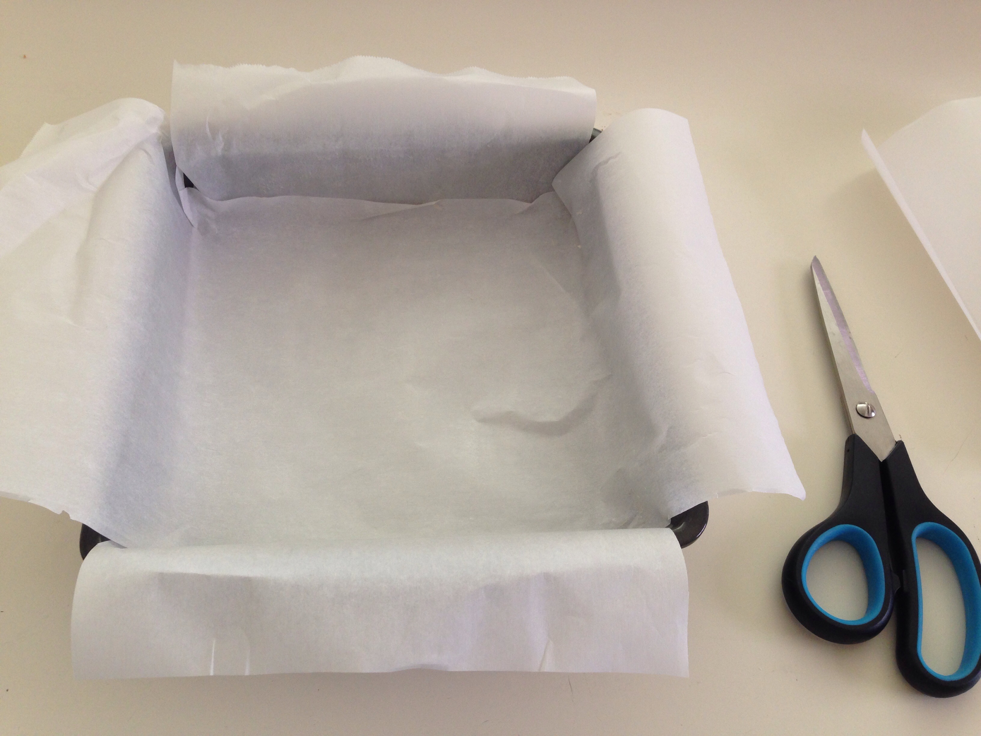 Cut strips of parchment paper to fit into a 9×9 pan to make it easy to remove the brownies from the pan. Grease the paper with butter. Set aside.