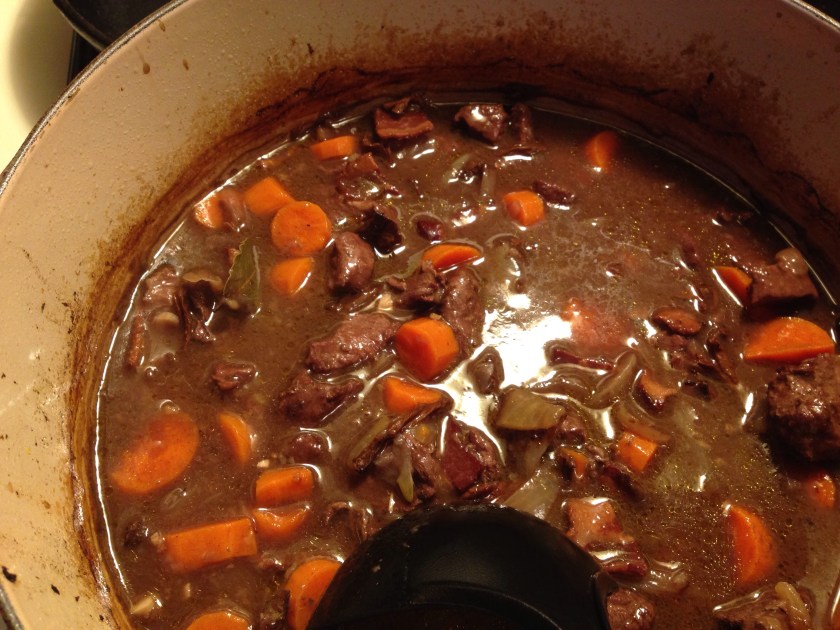 This is a near cousin of Beef Burgundy, and it is delicious. The smell of it cooking makes my mouth water in anticipation. The perfect thing for Sunday dinner.