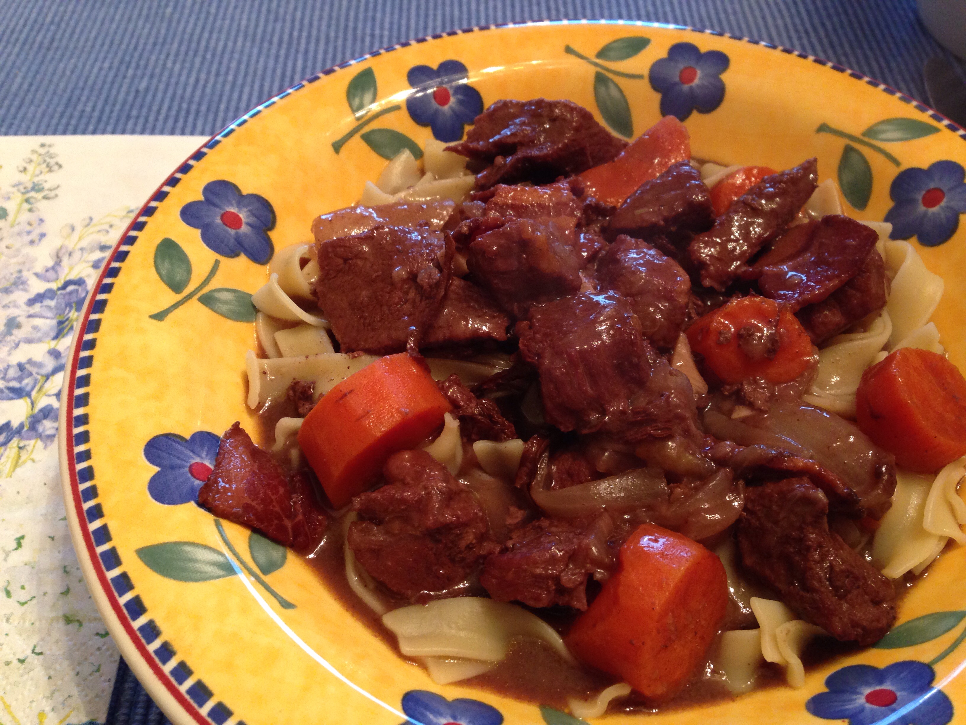 Soak mushrooms in 3/4 cup very hot water for 30 minutes. Sauté bacon until crisp and remove from pan. Leave 2 Tbsp. bacon fat in the pan to brown the beef cubes. When browned, remove the beef from the pan. Add onions, carrots, garlic, salt and pepper to the pan, cooking until a little soft. Sprinkle with flour, cooking 1 minute. Add mushrooms and soaking liquid, wine and stock. Add thyme and bay and return bacon and beef to the pot. Cover and cook at 325 degrees F for 2 1/2 – 3 hours, until meat is fork tender. Thicken with a little flour and water mixture if gravy is too thin. I like to serve it over egg noodles.