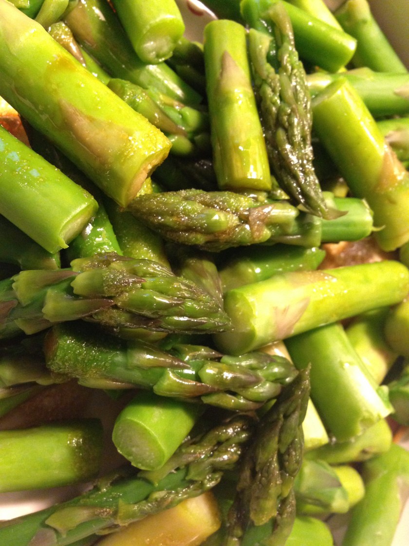Boil a pot of water. Cut asparagus into 2” pieces. Cook for 1 minute and rinse in cold water. Drain and dry. Add dressing. Can be served warm or at room temperature. This is a good buffet dish because it doesn’t need to be kept cold or hot.