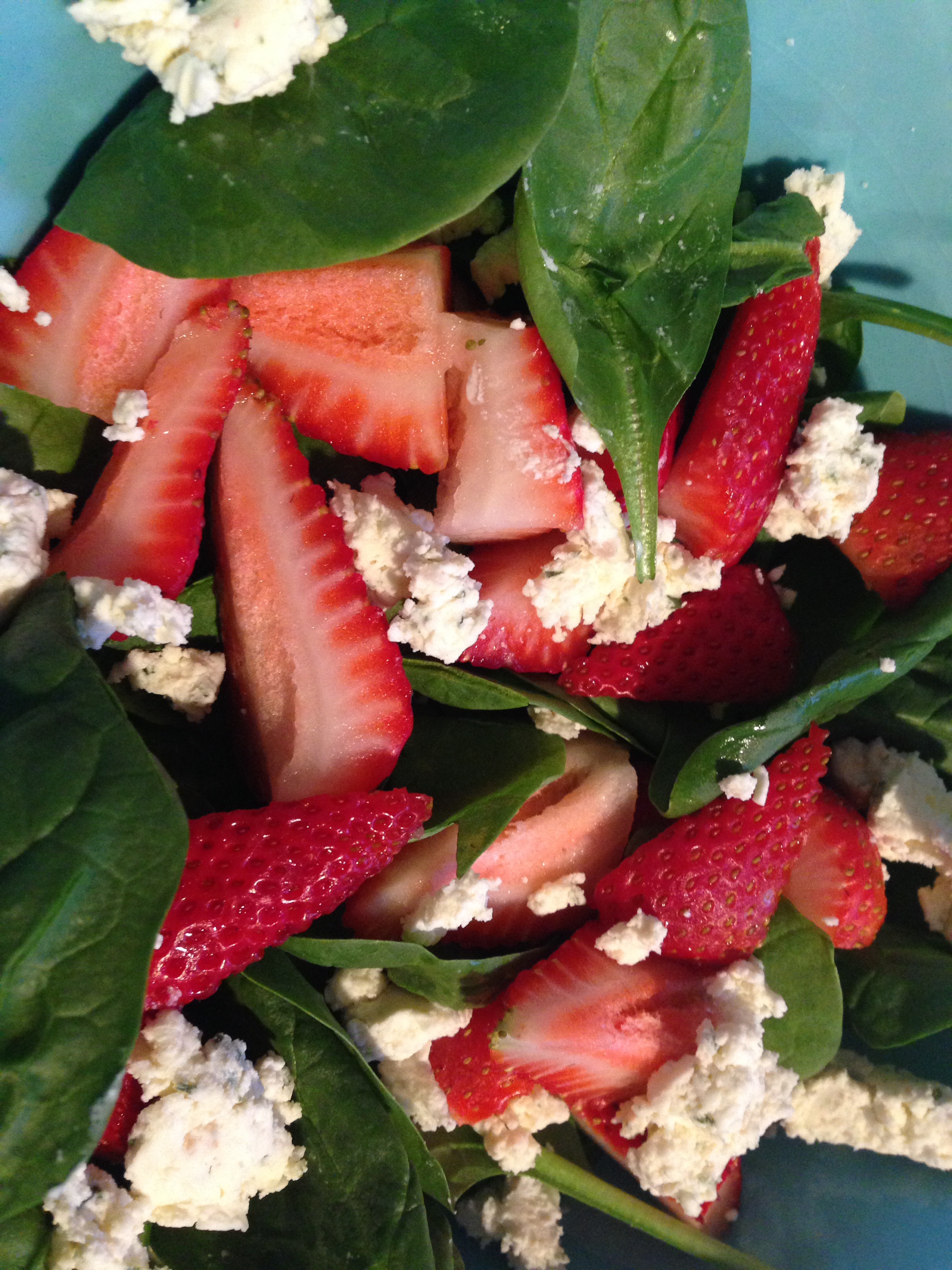 Add the strawberries and cheese to the spinach. Mix the oil, vinegar and seasonings. Add to salad
